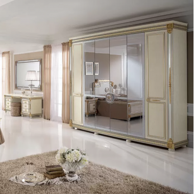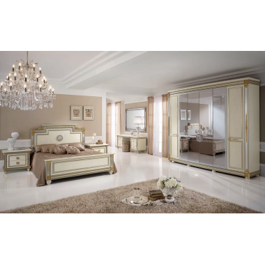 Sypialnia Liberty przywołuje atmosferę neoklasyczną – neoklasycyzm w duchu starożytnych modeli z tradycji greckiej i rzymskiej. Eleganckie ramy z geometrycznymi pracami zaznaczają przestrzeń i czynią ją harmonijną i elegancką. Kluczem do kolekcji jest zastosowanie czystej geometrii, która upraszcza dekorację podstawy, słusznie pozostawiając miejsce na rzemieślniczą obróbkę detali i wyrafinowany sitodruk z 24-karatowego złota płatkowego.