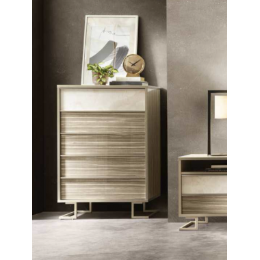 Szafy z lustrzanymi drzwiami, modułowe w różnych kombinacjach, idealnie komponują się z subtelnymi satynowymi liniami uchwytów i nóżek, dużymi i efektownymi zagłówkami oraz wieloma korzyściami funkcjonalnymi, takimi jak miękkie domykanie szafek nocnych i szuflad oraz możliwość dodanie wygodnego pojemnika do przechowywania do łóżka.