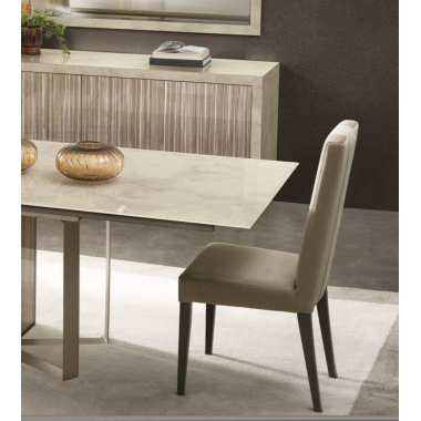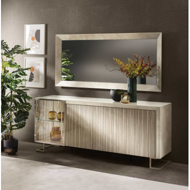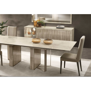 W jadalni Luce Light nowoczesny design charakteryzuje się eleganckim i wyrafinowanym stylem, skupiającym się na jasności wykończeń i asymetrycznych nutach kompozycji, która sprytnie łączy zamknięte przegródki i przegródki ze szklanymi drzwiami. Ta zmiana tworzy harmonijną równowagę pomiędzy estetyką i praktycznością, podczas gdy jasne i jasne wykończenia dodają lekkości i współczesnego uroku całemu pomieszczeniu.