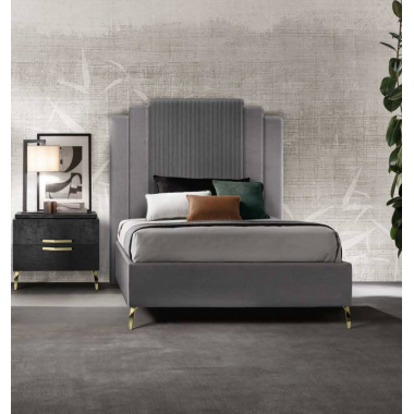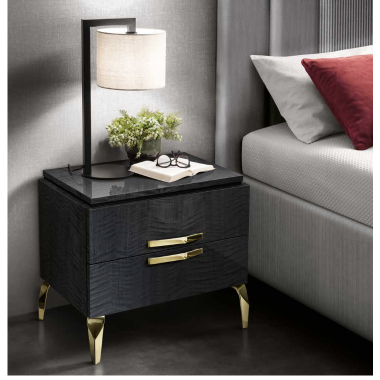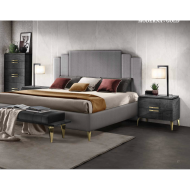 Druga i trzecia wersja, z akcesoriami odpowiednio w polerowanym złocie i chromie, zapewniają silniejszy efekt wizualny i dodają odrobinę blasku części sypialnej. Zarówno chromowane, jak i złote wykończenia ciemnych mebli wyróżniają się, tworząc połyskującą grę światła.
