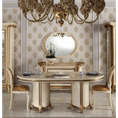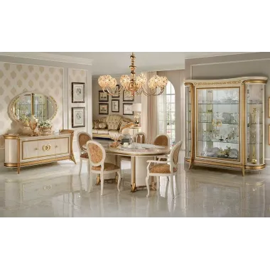 Wszystko w jadalni z kolekcji Melodia utrzymane jest w doskonałej harmonii chromatycznej i stylistycznej. Każdy element przyczynia się do tego, aby to rozwiązanie meblowe było spójne z włoskim duchem, z którego wywodzą się wszystkie kreacje Arredoclassic. Każda linia, szczegół i złocenie zostały zaprojektowane i wykonane z najwyższą starannością, przy zachowaniu najwyższych standardów jakości, aby zagwarantować nie tylko wspaniałą atmosferę, ale także miejsce, w którym można w pełni cieszyć się domem.