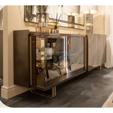 W centrum – imponująca komoda o lśniącej powierzchni, witryny niczym luksusowe szkatuły na światło i wspomnienia, oraz stolik kawowy, który łączy funkcjonalność z włoskim temperamentem.