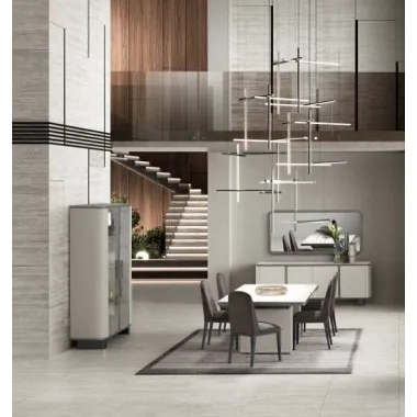 Głównym elementem kolekcji jest rozkładany stół jadalniany z blatem pokrytym szlachetnym trawertynem. Jego geometryczna forma i dopracowane detale czynią go nie tylko centrum jadalni, ale także stylowym punktem spotkań i rozmów. Neutralna kolorystyka w tonacjach kości słoniowej i ciepłej szarości subtelnie wpisuje się w każdą aranżację.