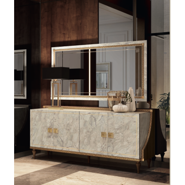 ROMANTICA Dining Collection to: klasyczna włoska elegancja w nowoczesnej interpretacji, połączenie marmuru, drewna i złotych detali, ekskluzywne meble do jadalni – stół, krzesła, witryny, kredensy, najwyższa jakość wykonania i dbałość o każdy detal.