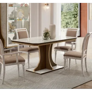 Blaty stołów wykonane są z eleganckich płyt w dekorze marmuru, które doskonale komponują się z delikatnym fornirem w kolorze orzecha. Złote zdobienia i geometryczne linie podkreślają włoski charakter kolekcji, a subtelne frezowania dodają całości lekkości i wyjątkowego wyrazu.
