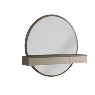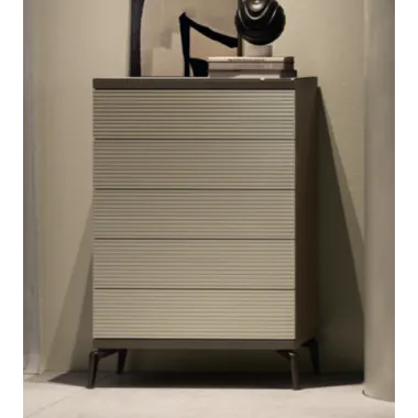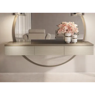 Subtelny kontrast między ciepłym, błotnistym odcieniem konstrukcji a żebrowanymi, szampańskimi frontamipodkreśla wysmakowaną formę i wyrafinowany styl mebli. Uzupełnieniem aranżacji są starannie dobrane dodatki z tej samej linii, które wzmacniają poczucie harmonii i nadają przestrzeni luksusowy, a zarazem przytulny charakter.
