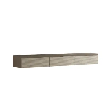 Wyróżnikiem kolekcji jest kontrast faktur i barw – ciepła struktura w odcieniu mudotula delikatnie żebrowane, szampańskie powierzchnie frontów, tworząc wyrafinowaną grę światła i cienia. Całość dopełniają geometryczne, metalowe bazy w kolorze brązu, które dodają meblom lekkości i elegancji.
