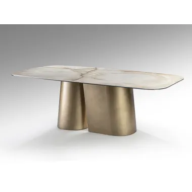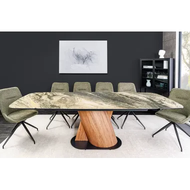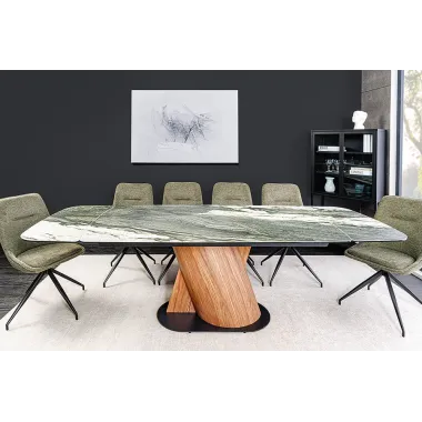 Połączenie nowoczesnego blatu ceramicznego z klasycznymi, drewnianymi nogami. Dostępny w różnych kolorach drewna. Cena: 2 999 zł.