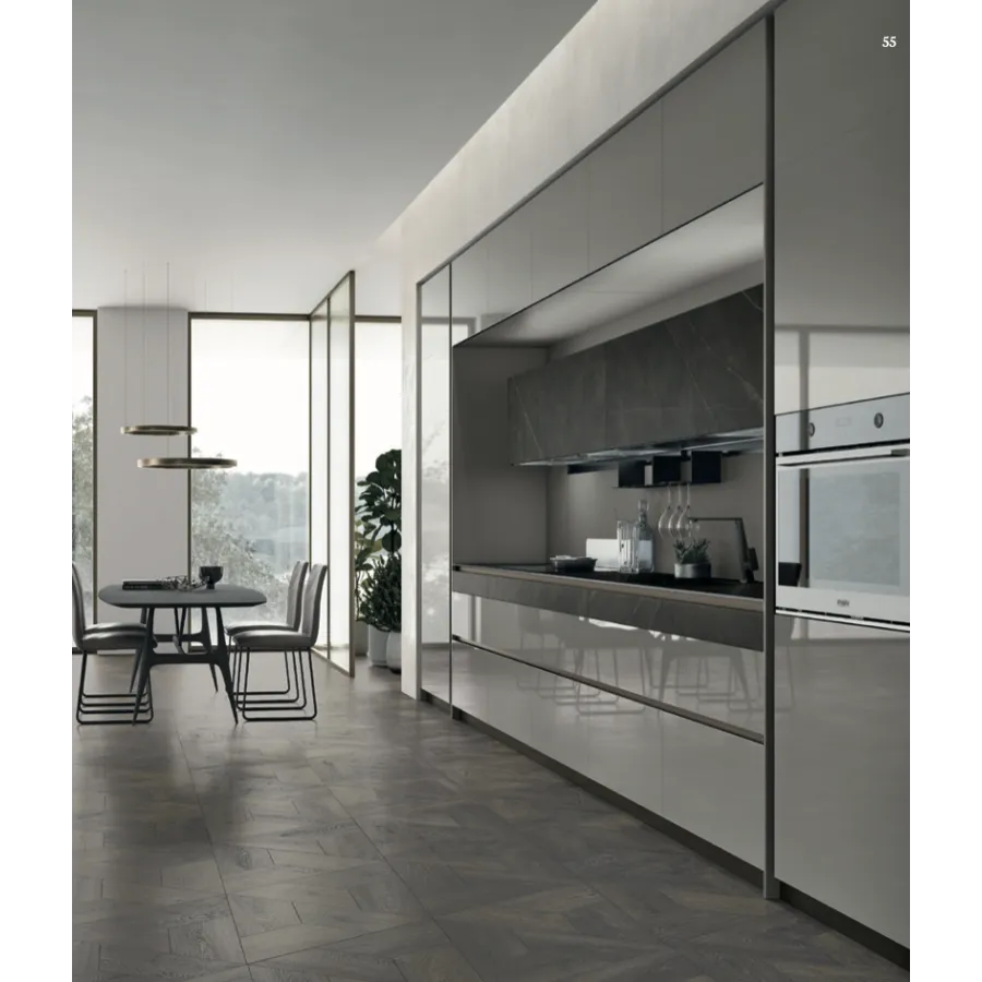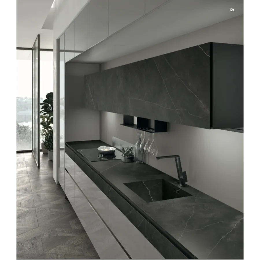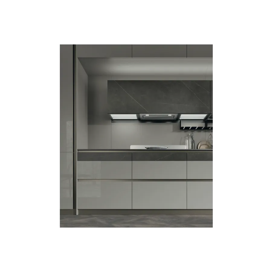 Panel ścienny Joy System wykonany z Fenix Grigio Londra to rozwiązanie, które łączy estetykę z funkcjonalnością. Wyposażony w praktyczne akcesoria kuchenne, pozwala na ich swobodne rozmieszczenie wzdłuż metalowego profilu, dzięki czemu można dostosować przestrzeń roboczą do indywidualnych potrzeb.