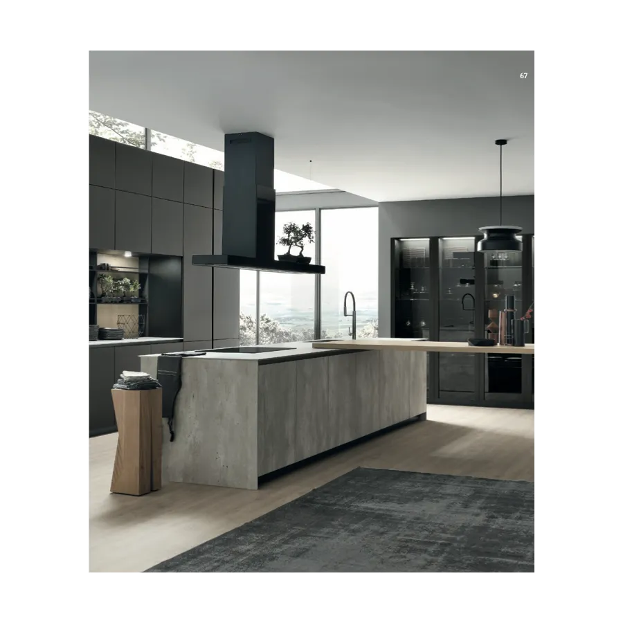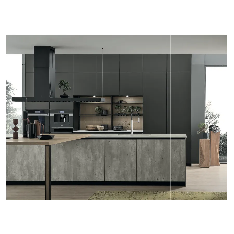 Centralnym elementem jest wyspa w wykończeniu HPL Argilla, pełniąca rolę praktycznego centrum pracy. Towarzyszą jej kolumny w matowym szkle Nero oraz witryny z ramą aluminiową w kolorze czarnym szczotkowanym i półprzezroczystym szkłem w odcieniu szarości.
