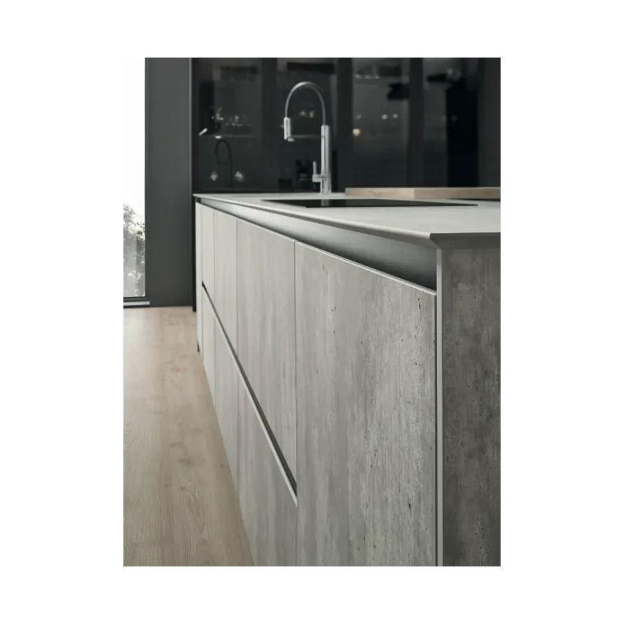 Nowoczesny charakter HPL Argilla w połączeniu z wykończeniem Nero spazzolato we frezowaniu uchwytowym tworzy wyspę o jednolitej, zwartej formie. Jest ona mocna i zdecydowana zarówno pod względem funkcjonalności, jak i czystych, wyrazistych linii, które podkreślają jej nowoczesny styl.