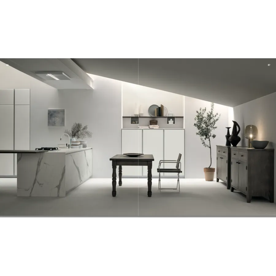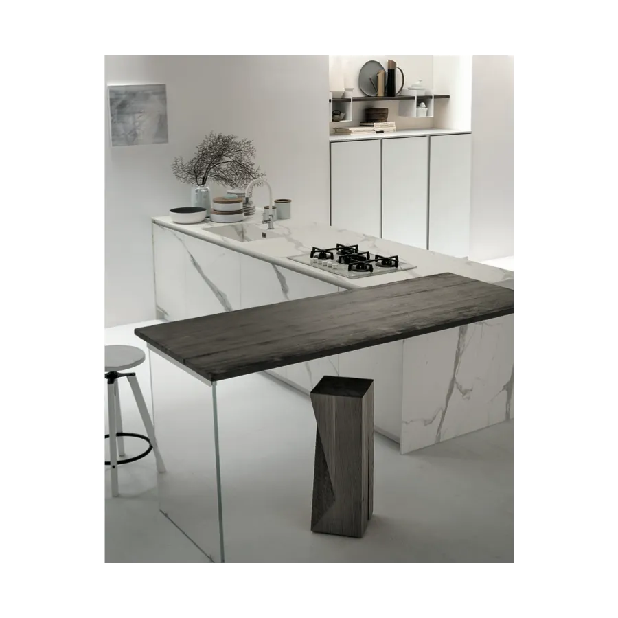 Harmonię dopełniają kolumny w szkle Bianco Ice matowym, które wnoszą do wnętrza świetlistość i delikatność, przełamując masywność zabudowy. Z kolei elementy w wybarwieniu Wood Grey – stoły i komody – wprowadzają naturalność, trwałość i równowagę, podkreślając ponadczasową elegancję kuchni.
