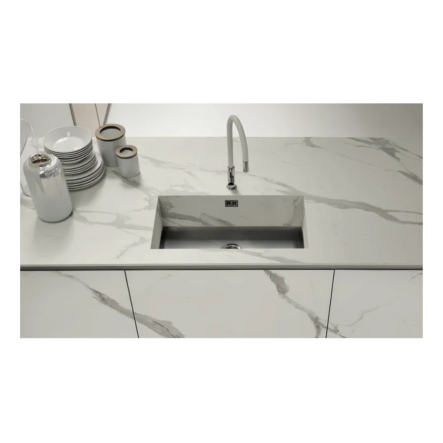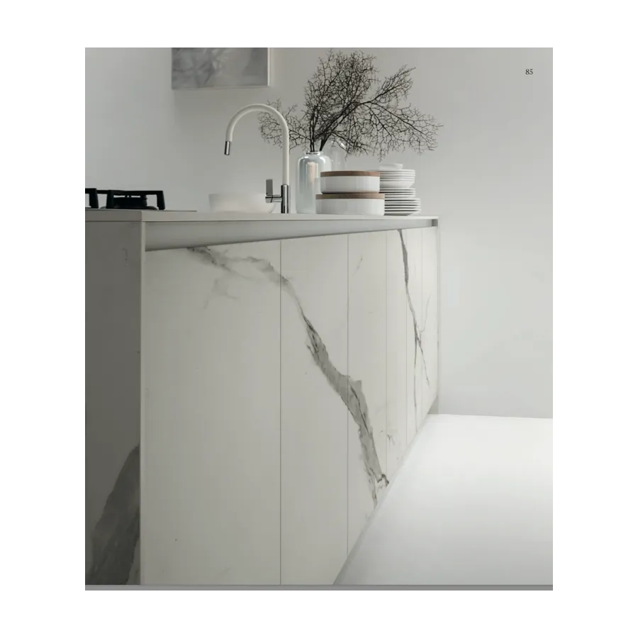 Fronty, boki, blat oraz zintegrowany z blatem zlewozmywak zostały wykończone HPL Calacatta z delikatnymi żyłkami imitującymi marmur. Materiał ten subtelnie, a zarazem efektownie otula całą wyspę, nadając jej wyjątkową elegancję i spójność formy. Całość dopełnia frezowanie uchwytowe (gola) w tonacji dopasowanej do wykończenia, co podkreśla jednolity, wyrafinowany charakter zabudowy.