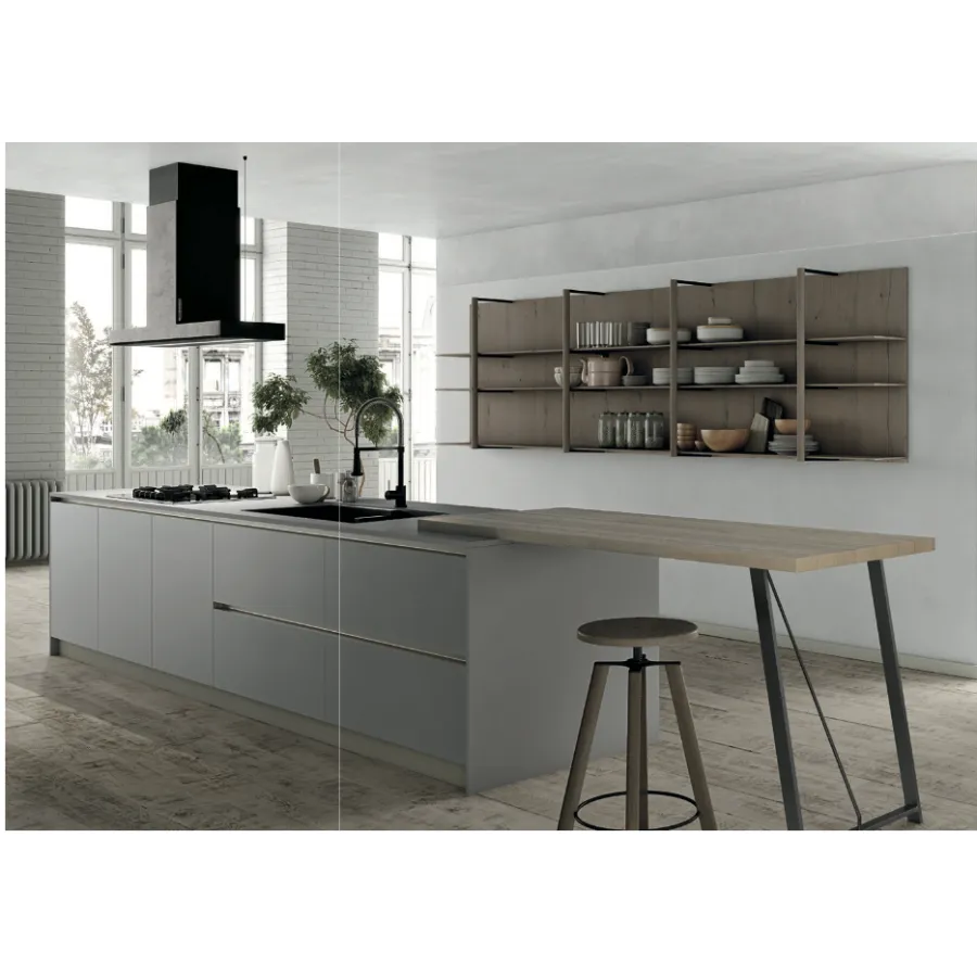 Ciepły akcent wnosi drewno Rovere Sahara, wykorzystane w blacie typu snack oraz w otwartych wnękach, które przełamują chłodniejsze tonacje i dodają aranżacji przytulności.