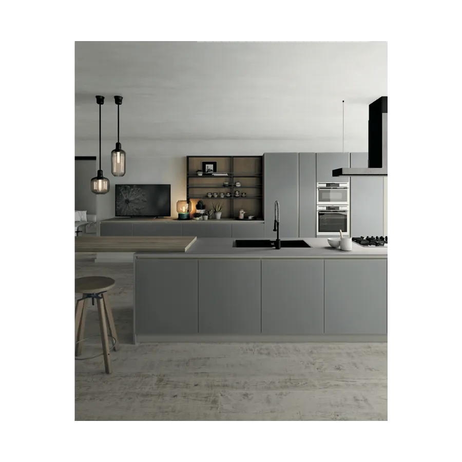 Wyraźne linie i nowoczesny charakter podkreśla Fenix Grigio Antrim, użyty na bokach oraz blatach roboczych. Z kolei wykończenie Titanio, obecne w cokole i uchwycie frezowanym (gola), dodaje całości elegancji i wyrafinowania.