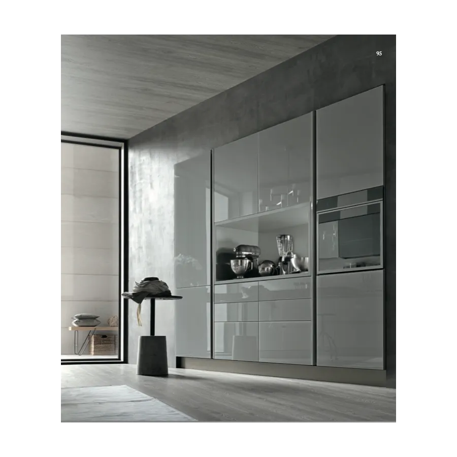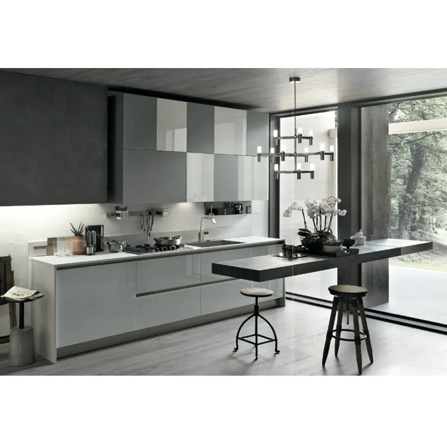 Fronty szafek wiszących w szkle błyszczącym i matowym przeplatają się ze sobą, tworząc oryginalne geometryczne układy. Całość dopełniają detale w wykończeniu Titanio – frezowane uchwyty (gola) oraz cokół – które podkreślają nowoczesny i spójny charakter kuchni.