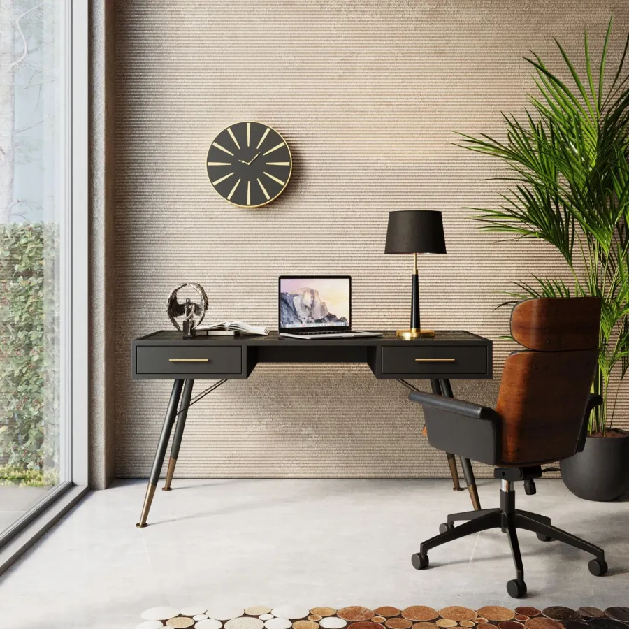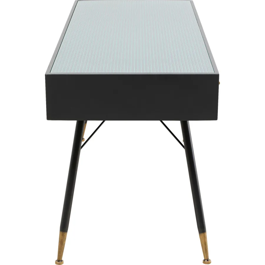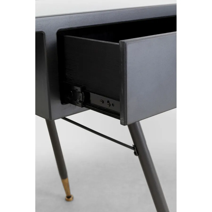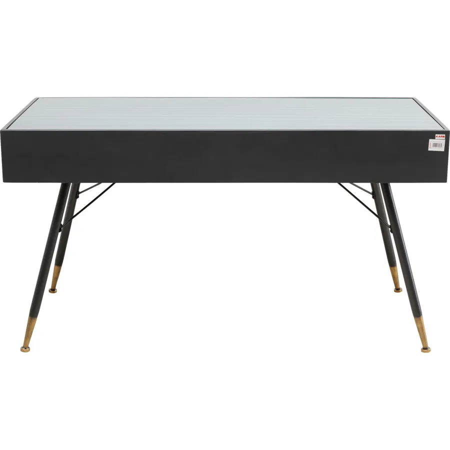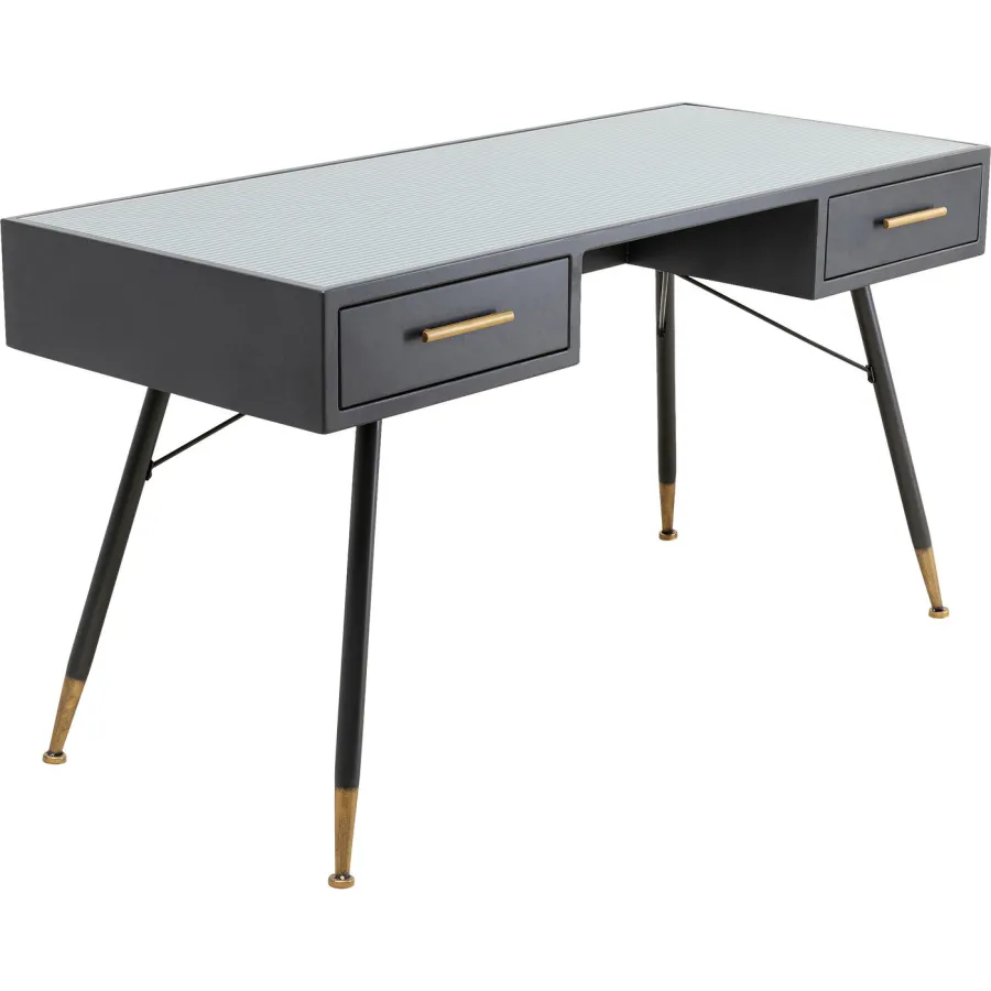 Metalowe biurko z kolekcji Gomera urzeka swobodnym połączeniem wytrzymałej stali i szklanego blatu z ząbkowaną krawędzią