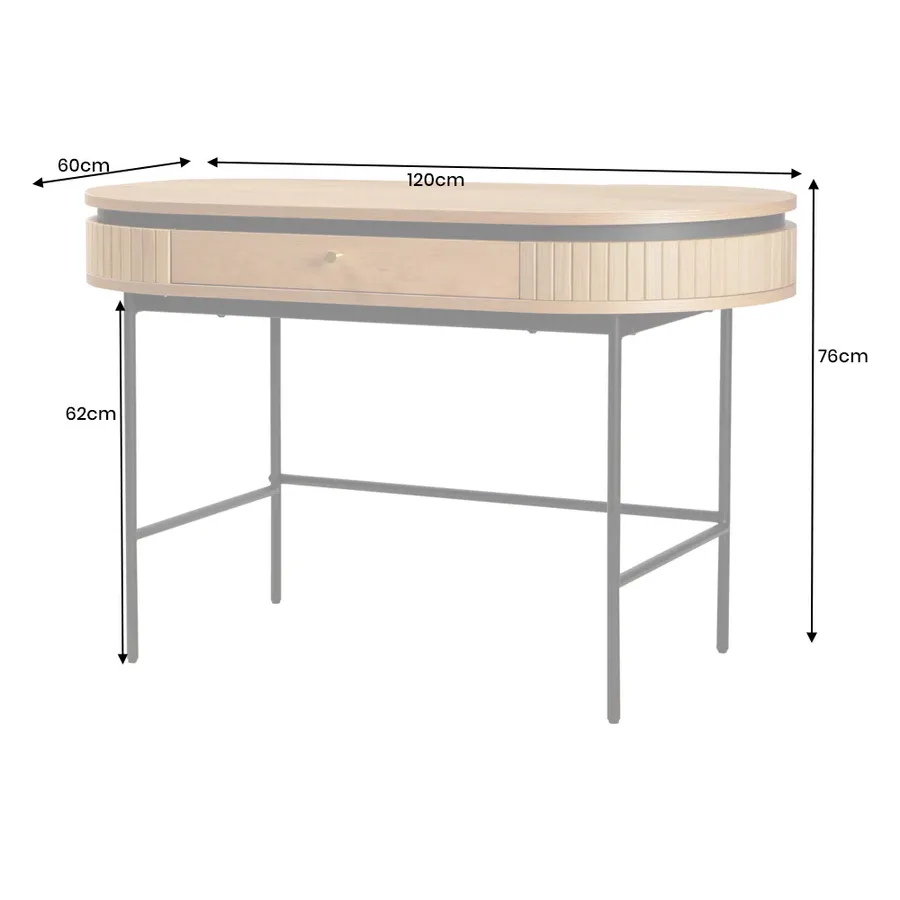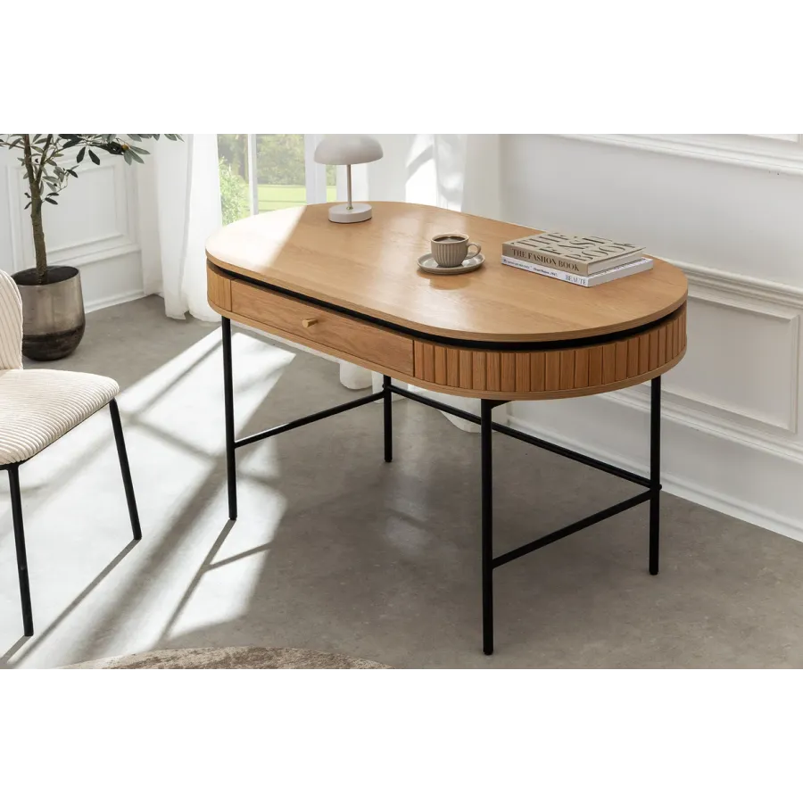 Biurko ATELIER łączy ponadczasowy design z nowoczesną praktycznością. Smukła, czarna metalowa podstawa harmonijnie komponuje się z zaokrąglonym blatem wykończonym fornirem dębowym, wprowadzając do wnętrza ciepło i styl. Charakterystyczna ryflowana struktura po bokach oraz subtelnie zaokrąglone krawędzie podkreślają elegancki charakter mebla.