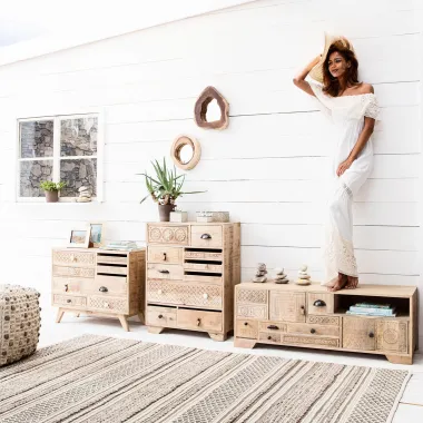 Urocze meble z serii Puro zachwycają dbałością o detale i artystycznie ręcznie rzeźbionymi zdobieniami. Jasny, naturalny kolor dodaje świeżości i nowoczesności.
