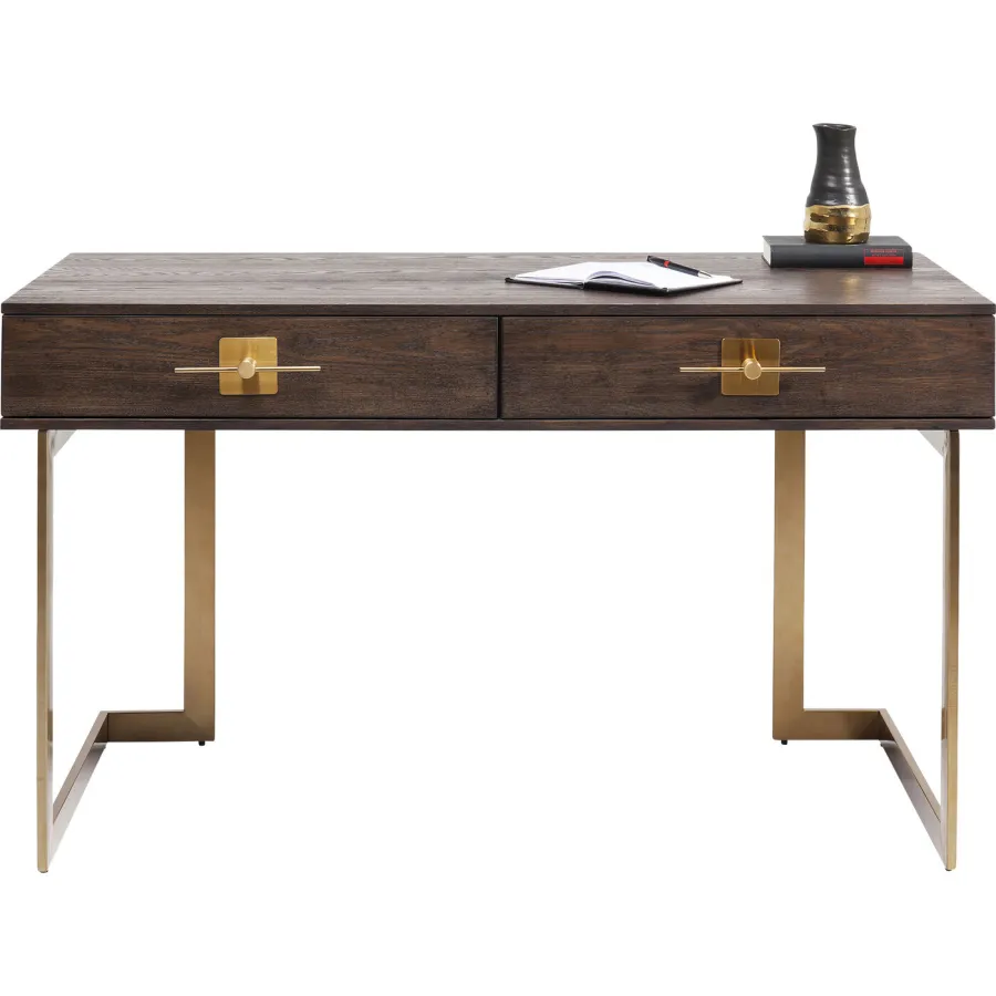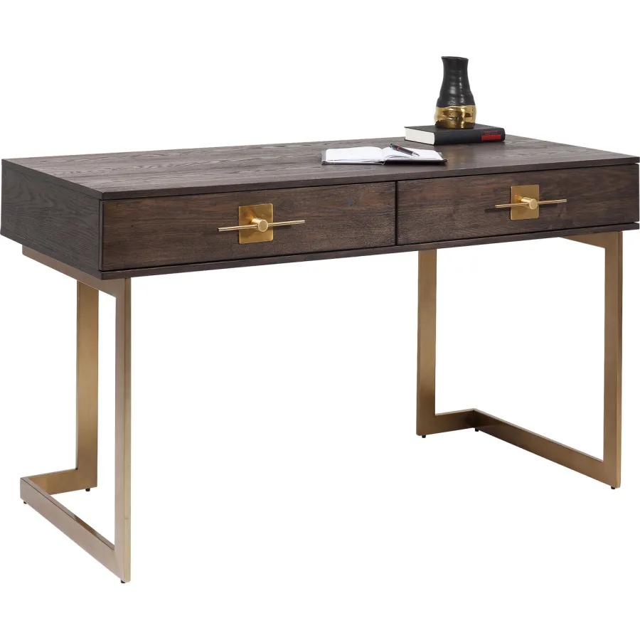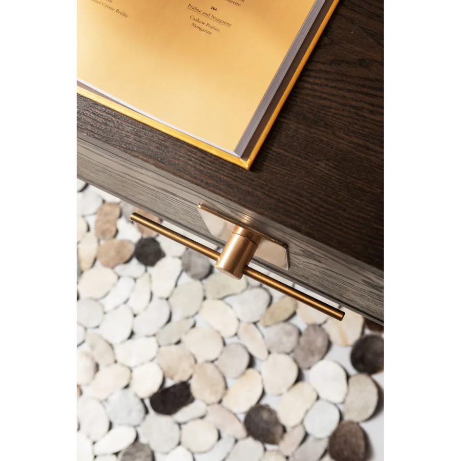Klasyczne biurko, które sprawdzi się również we wnętrzu luksusowego jachtu żaglowego. Okucia prętów, graficzna mosiężna rama i ciemny fornir jesionowy stanowią fajne połączenie stylu globtrotera i modernizmu. Dostępne są także inne modele mebli z serii Osaka