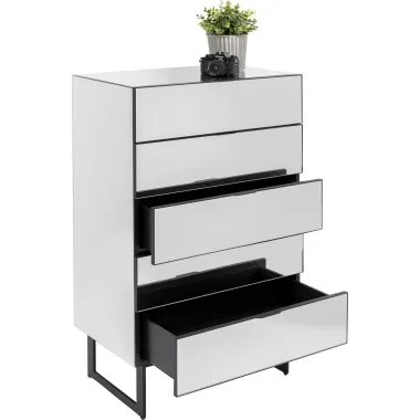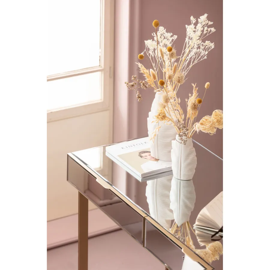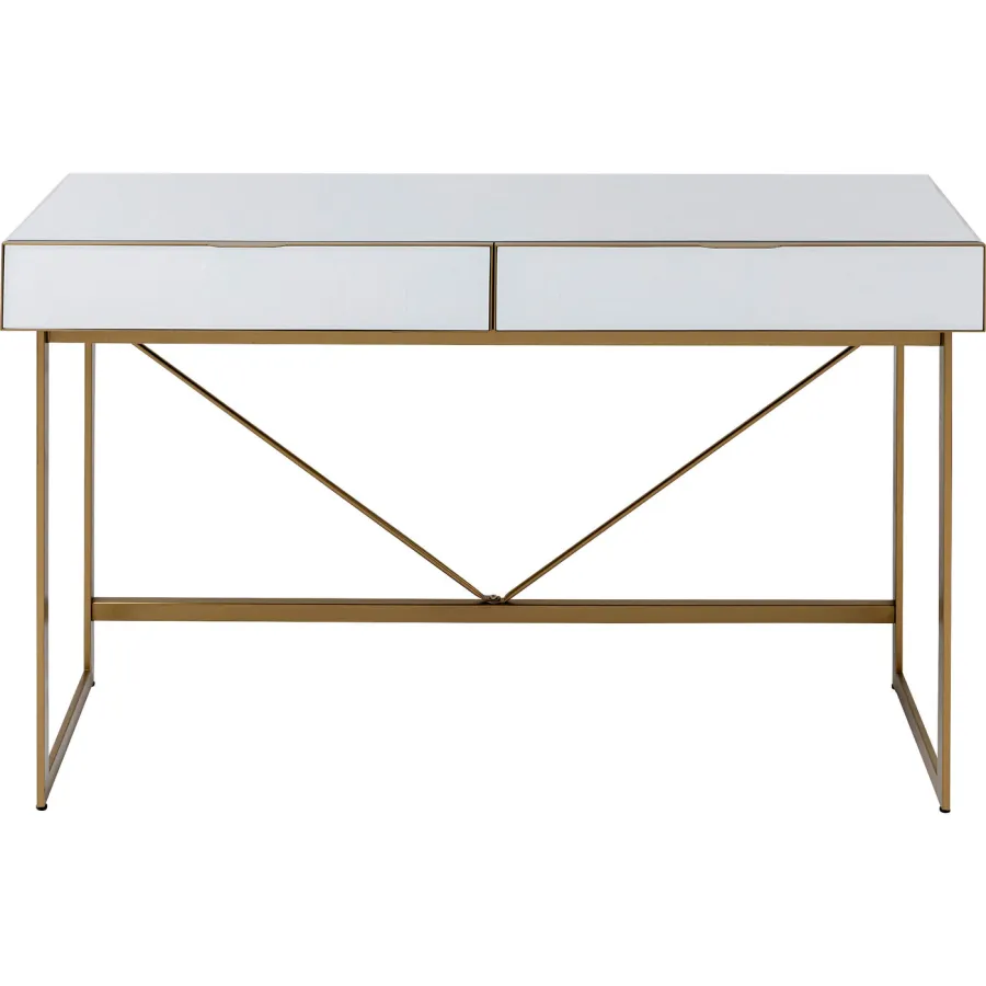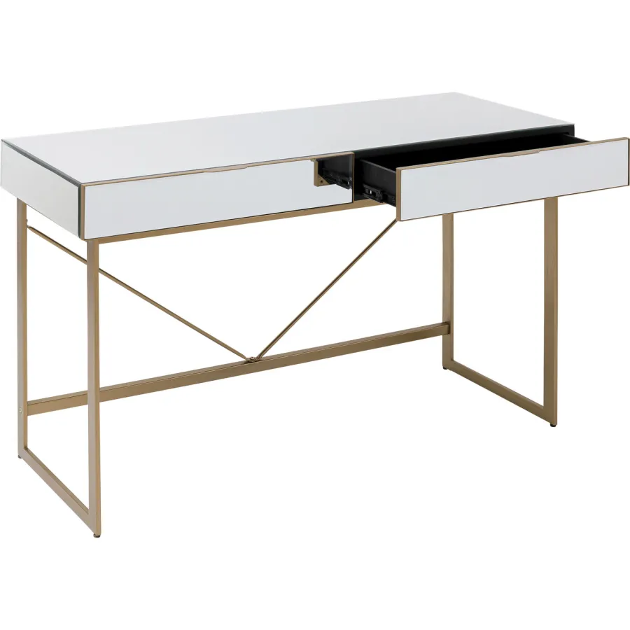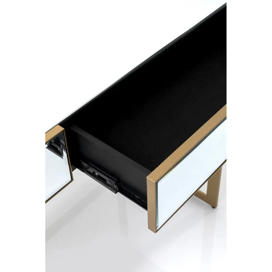 Biurko Soran zajmuje swoje miejsce w pomieszczeniu niczym designerski przedmiot. Góra, fronty i boki ramy pokryte są lustrzanym szkłem, które ma wyrafinowane wykończenie na krawędziach. Możesz w każdej chwili zintegrować ten odbijający stół ze swoim salonem, sypialnią lub pokojem gościnnym, ponieważ Soran wcale nie wygląda jak stół do pracy. To właśnie sprawia, że jest tak urokliwy i w każdej chwili można go wykorzystać jako toaletkę lub konsolę. Jednocześnie biurko w stylu glamour oferuje wszystkie zalety stacji roboczej: szerokość 120 cm i głębokość 50 cm, na blacie znajduje się miejsce na laptopa i dokumenty robocze. Można je błyskawicznie schować w dwóch pojemnych szufladach, a Twoja praca zostanie zapomniana. Blat można szybko i higienicznie oczyścić za pomocą kropli środka do czyszczenia szkła. Przy takim imponującym biurku miło jest usiąść o poranku i stylowo wykonać swoją pracę
