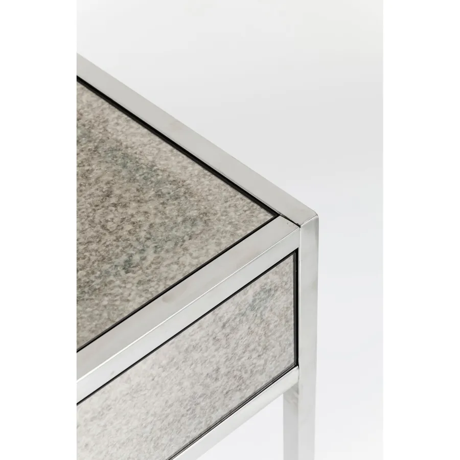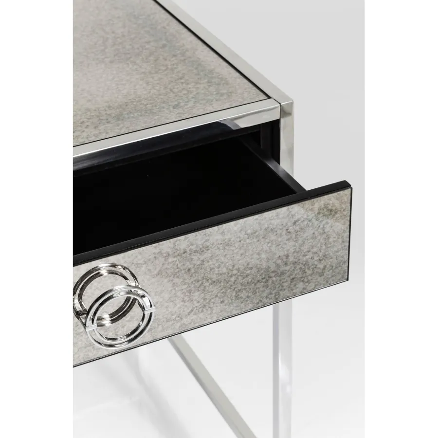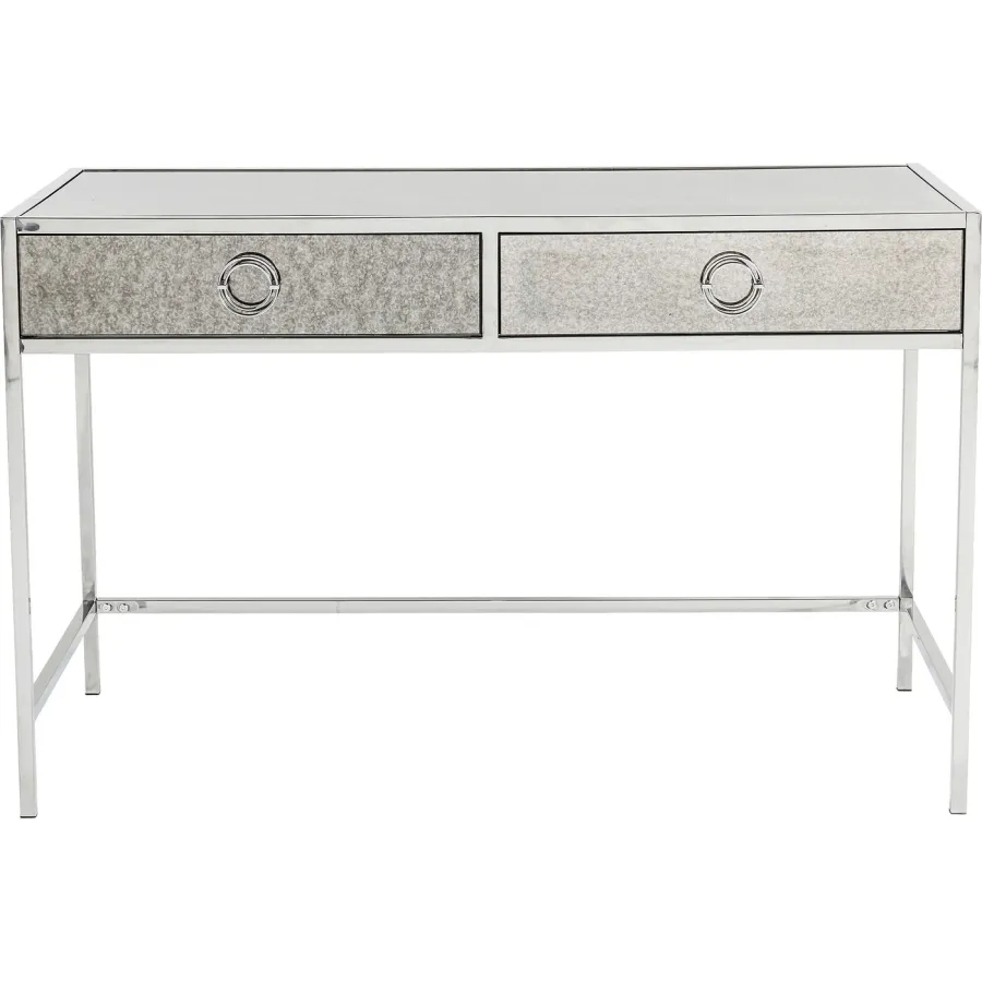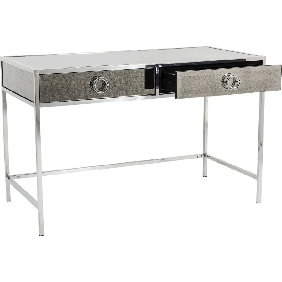 Nowoczesne wyrafinowanie. Biurko z serii Moonscape robi wrażenie unikalnym połączeniem jasno zdefiniowanych form, dopracowanych detali i monochromatycznego wyglądu. Błyszcząca stal nierdzewna i szare lustrzane szkło o antycznym wyglądzie nadają mu mistyczny, efektowny akcent. Dwie szuflady z okrągłymi uchwytami są praktyczne i doskonale uzupełniają wygląd