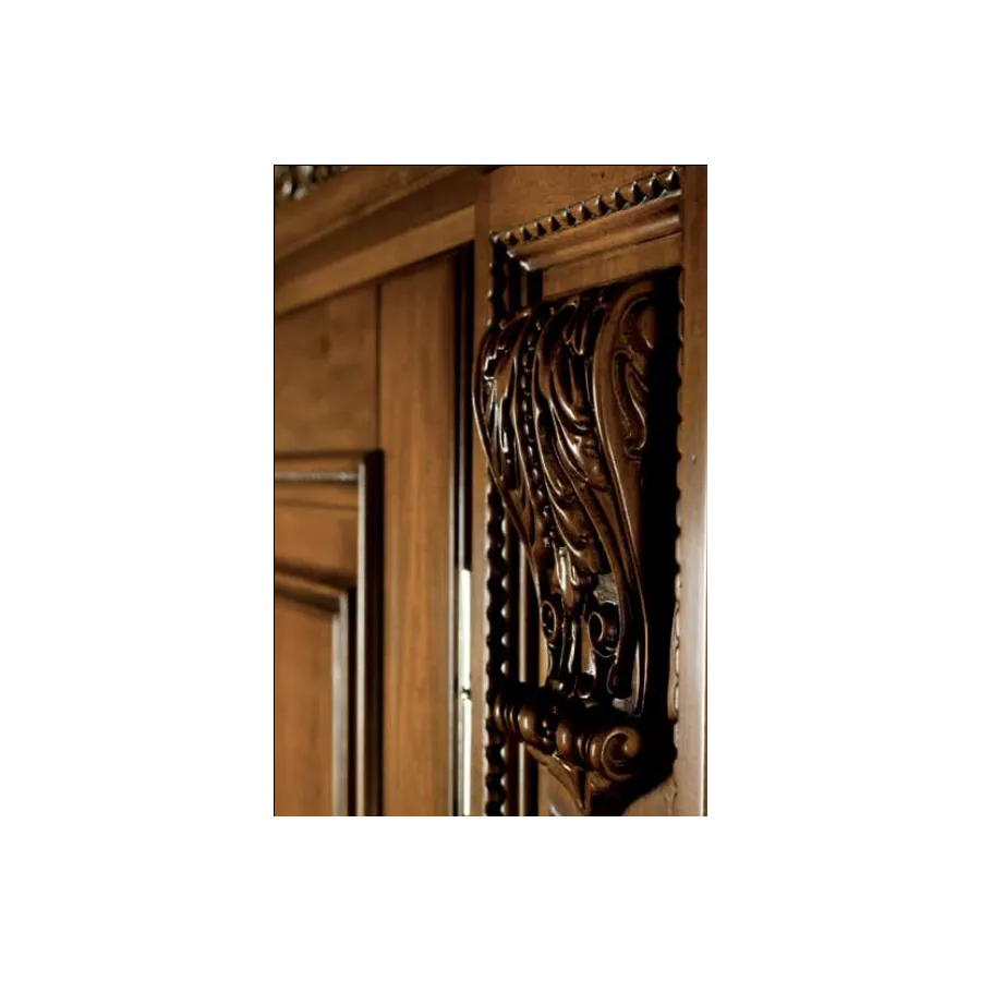 Eleganckie drzwi podwójne z wypełnieniem, zawieszone na mocnych zawiasach, które wyróżniają się subtelnymi rzeźbieniami na bocznych krawędziach oraz ozdobnymi kapitelami. Na górnej części znajduje się stylowy kapelusz z paskami na ramionach, który dodaje całości wyrafinowanego charakteru. Rama drzwi jest zaprojektowana w minimalistycznym stylu, a wewnętrzna część posiada wyjątkowy freskowy panel zdobiony rzeźbionymi kwadratami, nadającym drzwiom unikalny wygląd. Uchwyty są wykonane z mosiężnych tulei, co zapewnia trwałość i elegancję. Wykończenie w odcieniu głębokiej wiśni, pokryte naturalnym woskiem pszczelim, podkreśla naturalne piękno drewna, nadając mu ciepły połysk.
