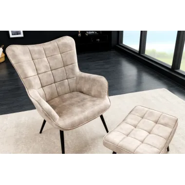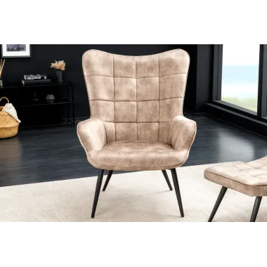Nowoczesny, ikonowy fotel wypoczynkowy o prostym kształcie i detalach w postaci poziomego przeszycia z pikowaną środkową pionową linią. Beżowy kolor sprawi, iż mebel będzie idealnym dodatkiem do każdego wnętrza.