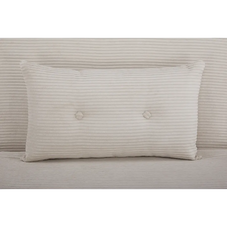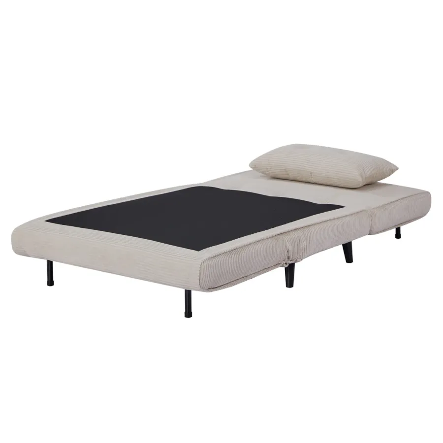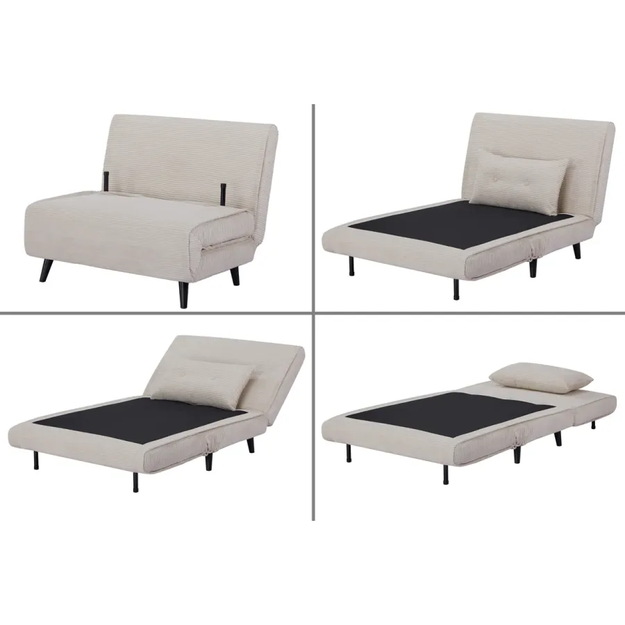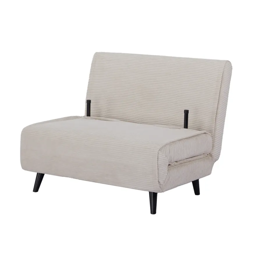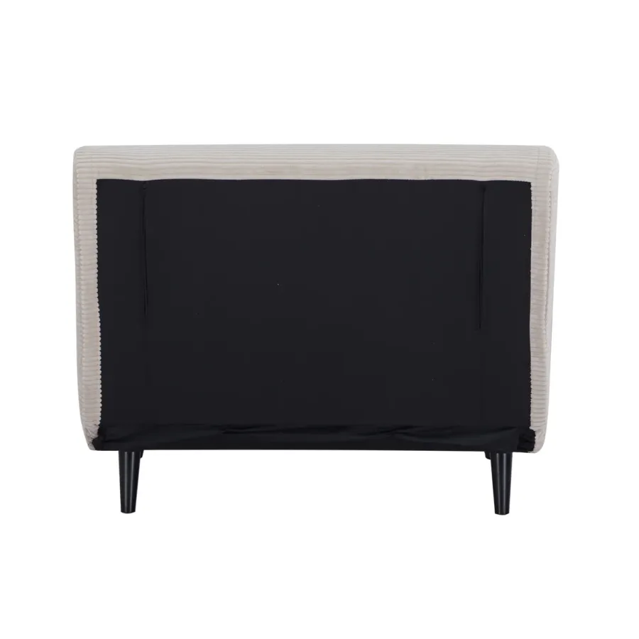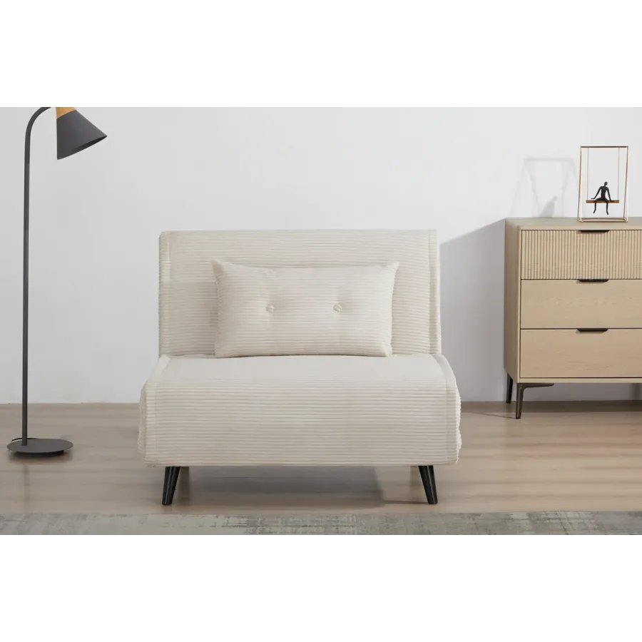 Duży fotel rozkładany SMART MULTIFUNCTION zachwyca czystym designem, wysoką funkcjonalnością i ponadczasowym stylem retro. Miękkie, sztruksowe obicie w stylowym beżu zapewnia wyjątkowo przyjemną i domową atmosferę. Dołączone dekoracyjne poduszki podkreślają przytulny charakter fotela i zapewniają dodatkowy komfort. Czarne, lakierowane nóżki z drewna sosnowego dodają wyrafinowanego charakteru i są wyposażone w praktyczne filcowe podkładki – idealne do delikatnych podłóg.