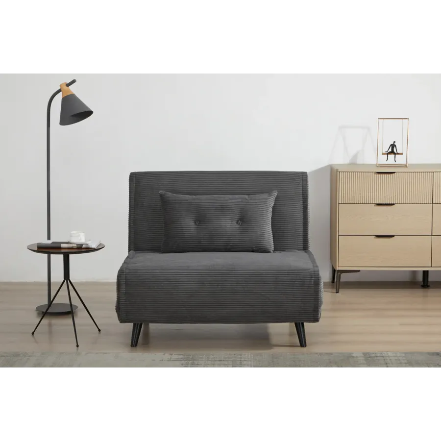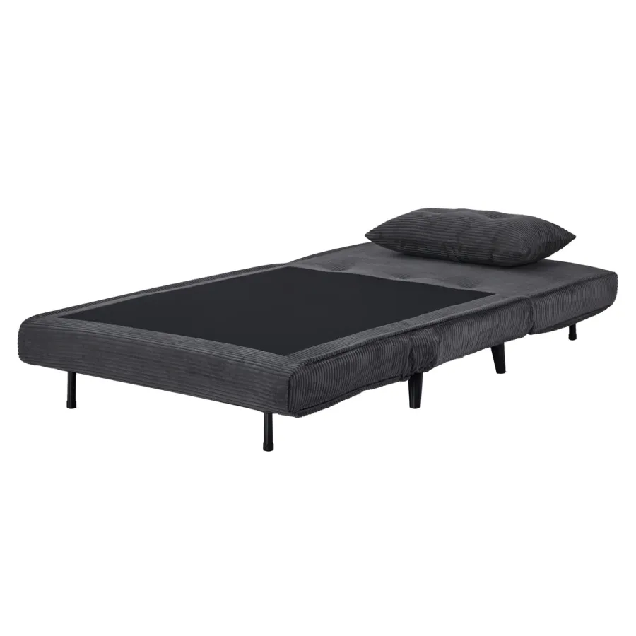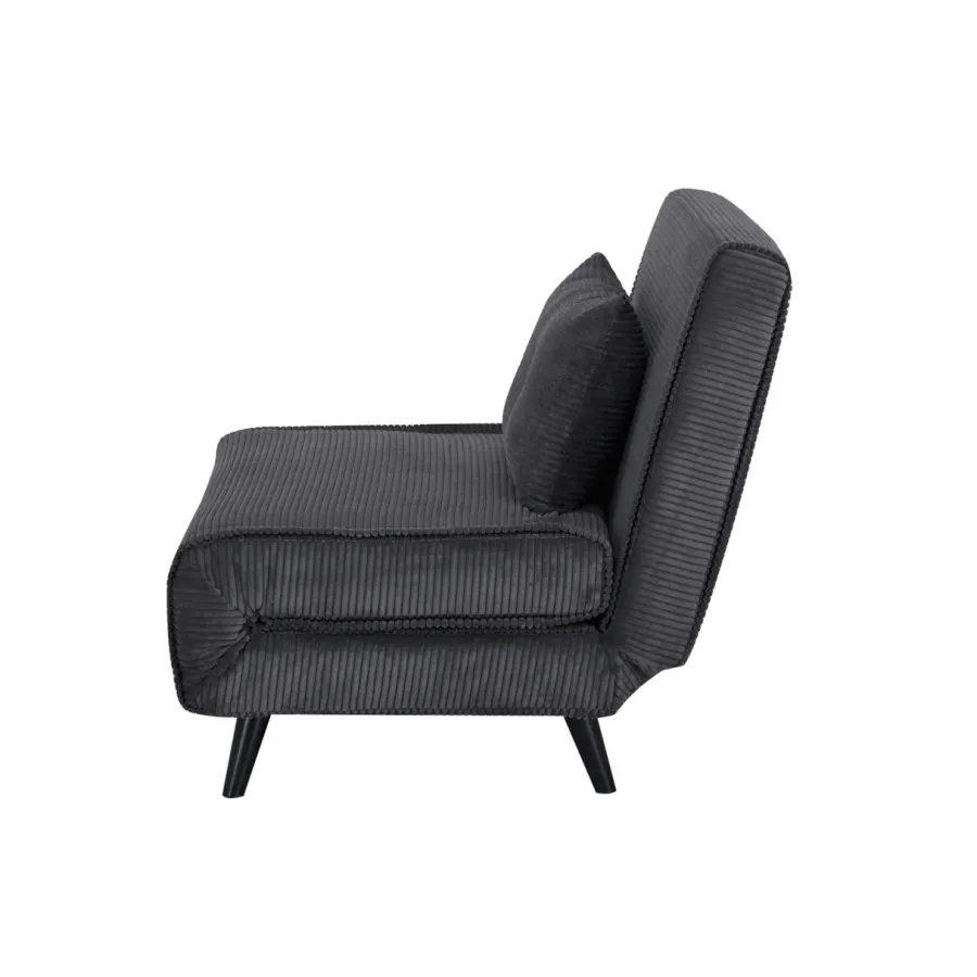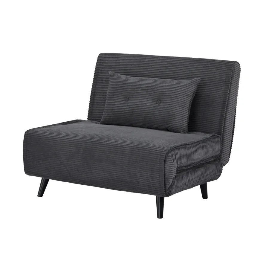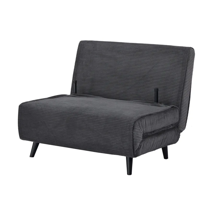 Duży fotel rozkładany SMART MULTIFUNCTION zachwyca czystym designem, wysoką funkcjonalnością i ponadczasowym stylem retro. Miękkie, sztruksowe obicie w stylowym beżu zapewnia wyjątkowo przyjemną i domową atmosferę. Dołączone dekoracyjne poduszki podkreślają przytulny charakter fotela i zapewniają dodatkowy komfort. Czarne, lakierowane nóżki z drewna sosnowego dodają wyrafinowanego charakteru i są wyposażone w praktyczne filcowe podkładki – idealne do delikatnych podłóg.