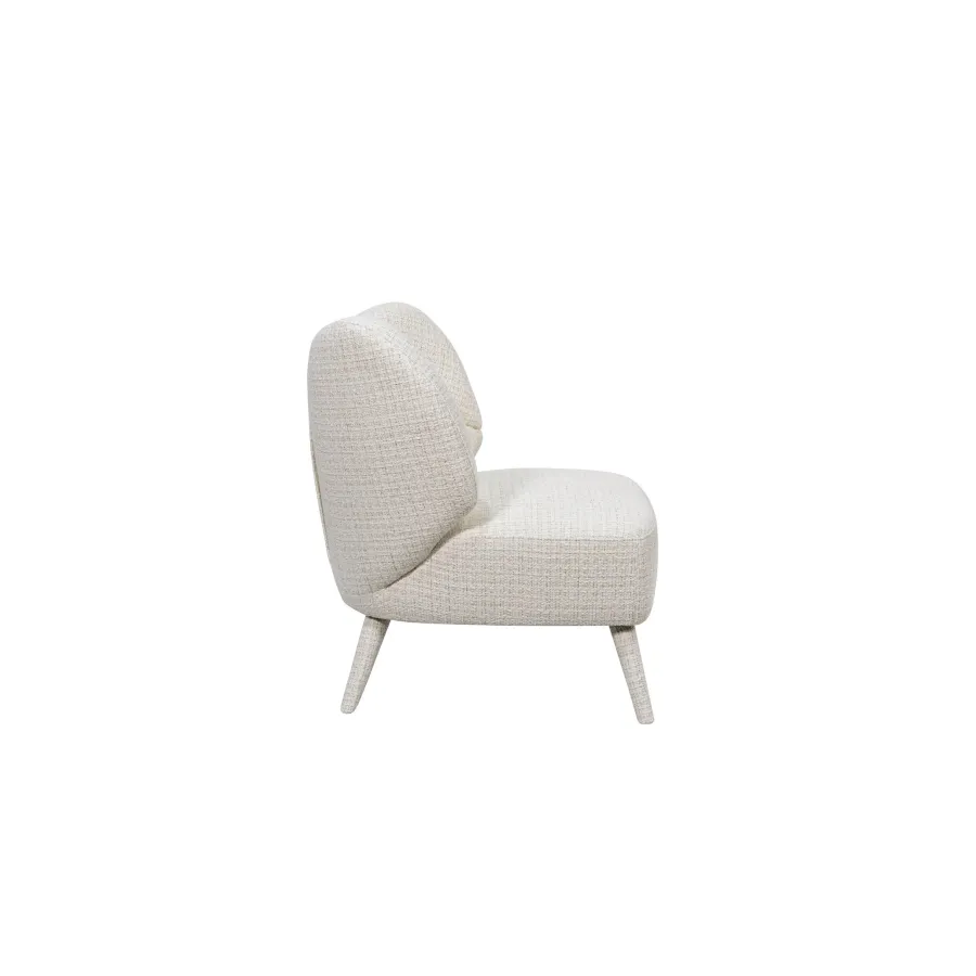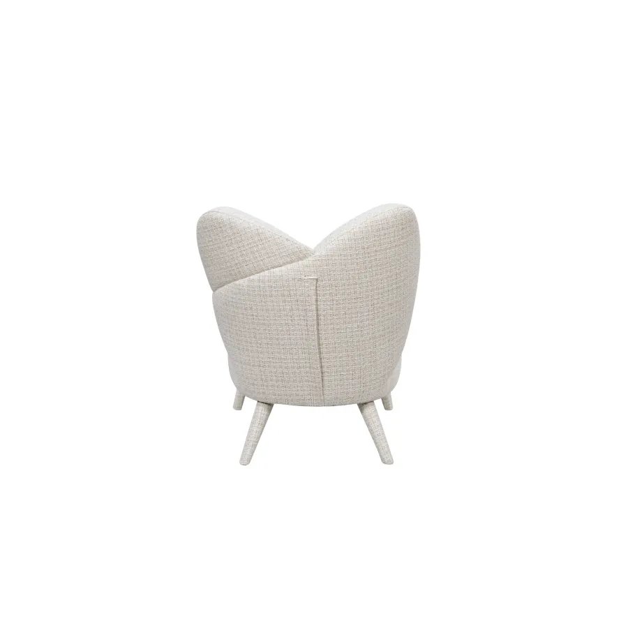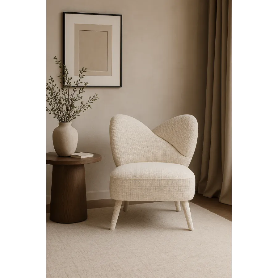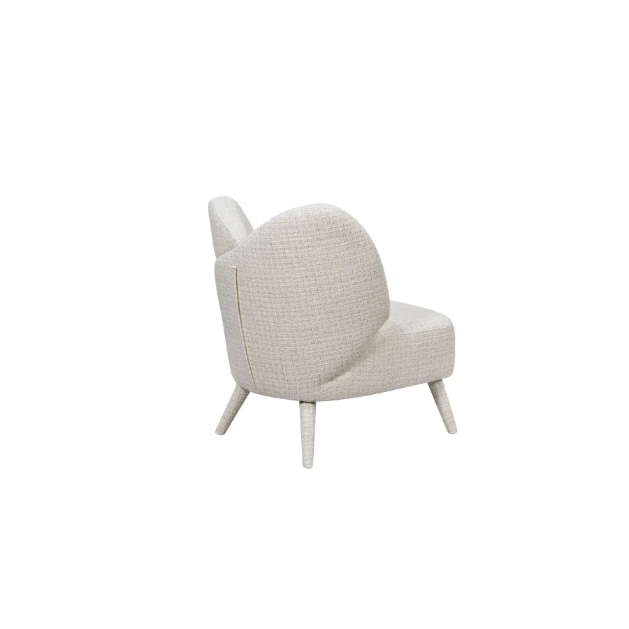 Fotel wypoczynkowy w stylu vintage o nietuzinkowym, obłym kształcie, w całości tapicerowany. Tkanina w odcieniach beżu i miękkim splocie supełkowym idealnie współgra z formą nawiązującą do klasycznego retro fotela klubowego.
