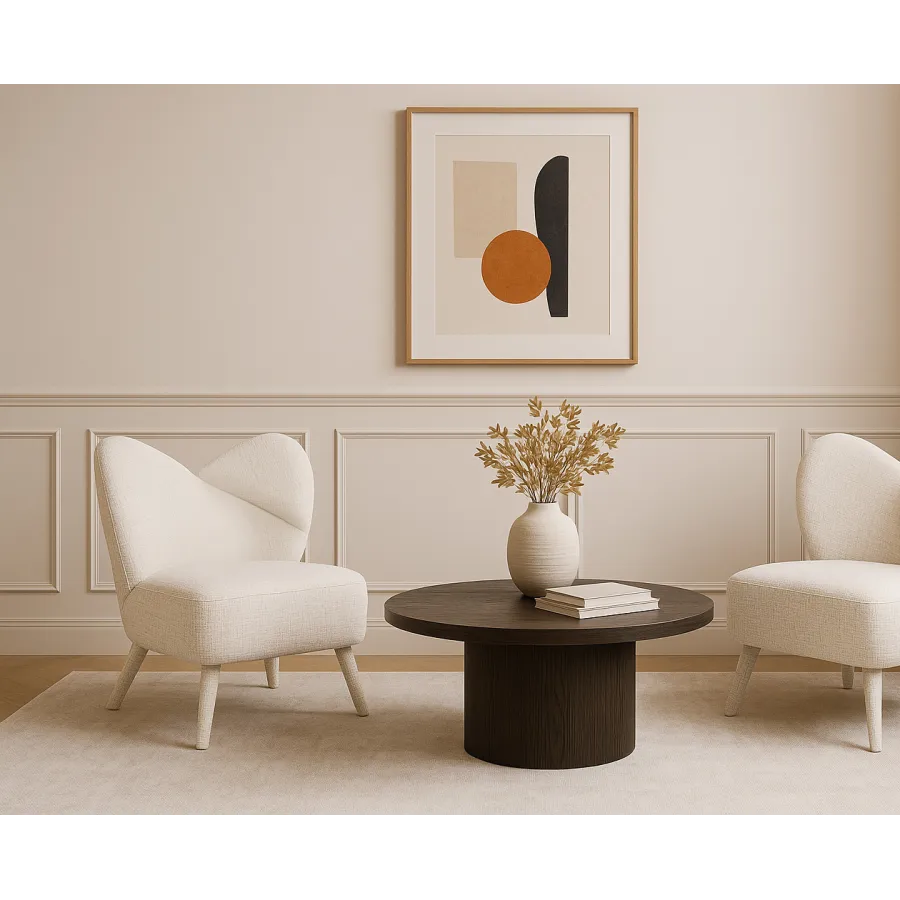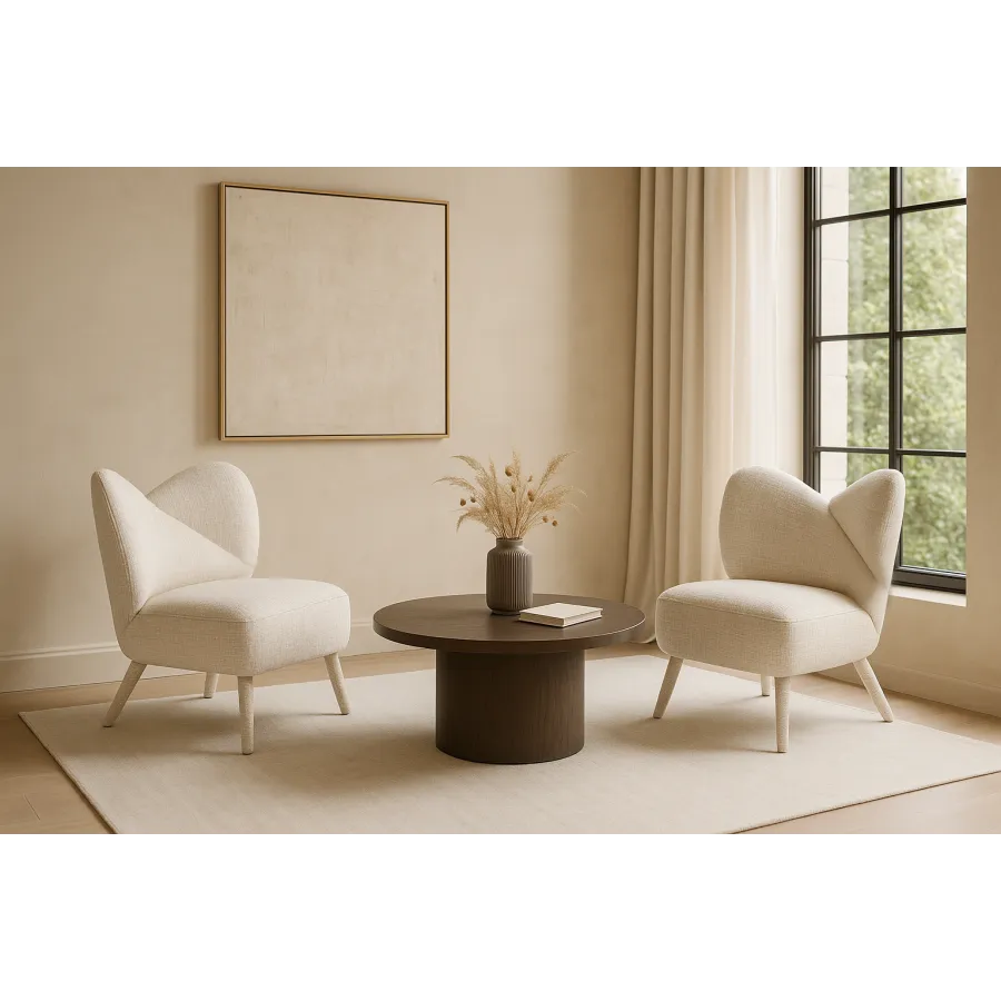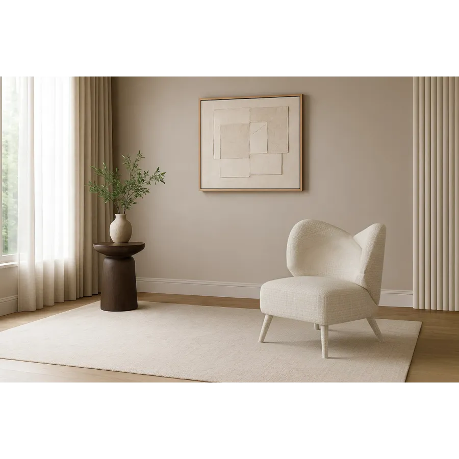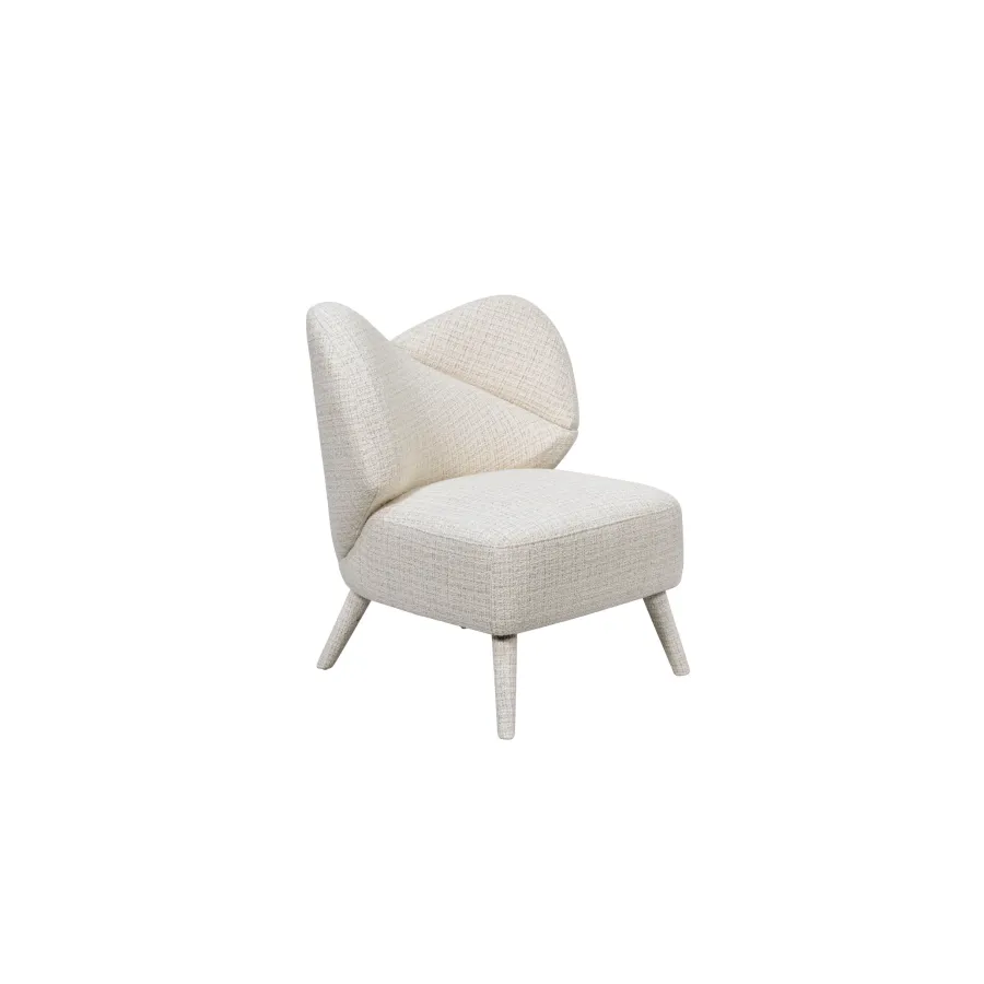Fotel wypoczynkowy w stylu vintage o nietuzinkowym, obłym kształcie, w całości tapicerowany. Tkanina w odcieniach beżu i miękkim splocie supełkowym idealnie współgra z formą nawiązującą do klasycznego retro fotela klubowego.