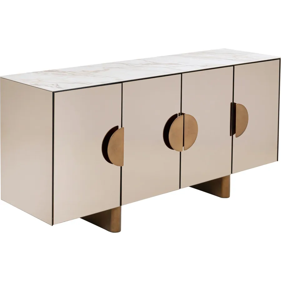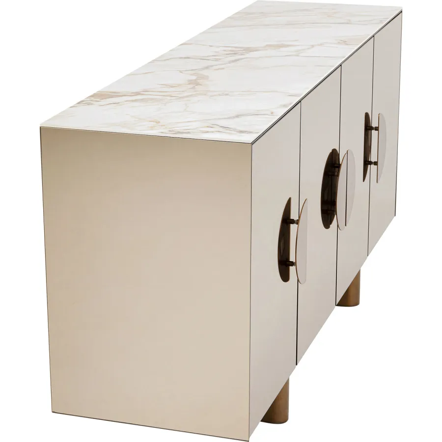 Korpus i fronty: szkło lustrzane, pokrywa: kamionka lakierowana, stopka/podstawa: stal malowana proszkowo, półka: płyta pilśniowa średniej gęstości (MDF) eukaliptusowa lakierowana, uchwyty: stal malowana proszkowo