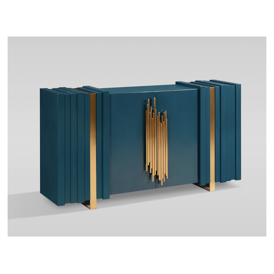 Oryginalna komoda w kolorze butelkowej zieleni ze złotymi akcentami w postaci ozdobnych uchwytów i nóg. Prosty design przełamany jest wykończeniem 3D idealnie spasowanym z nogami i kształtem uchwytów.