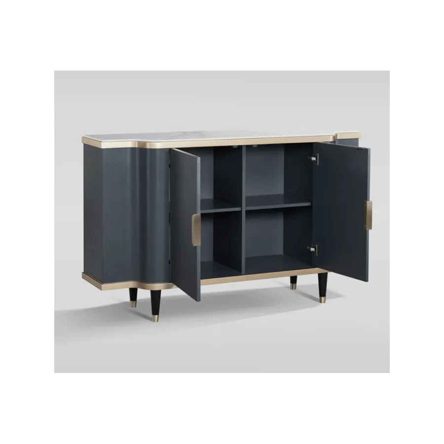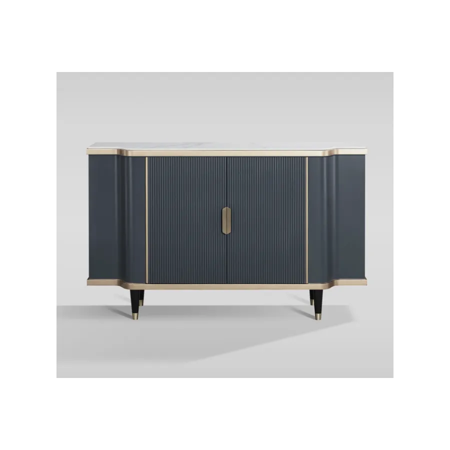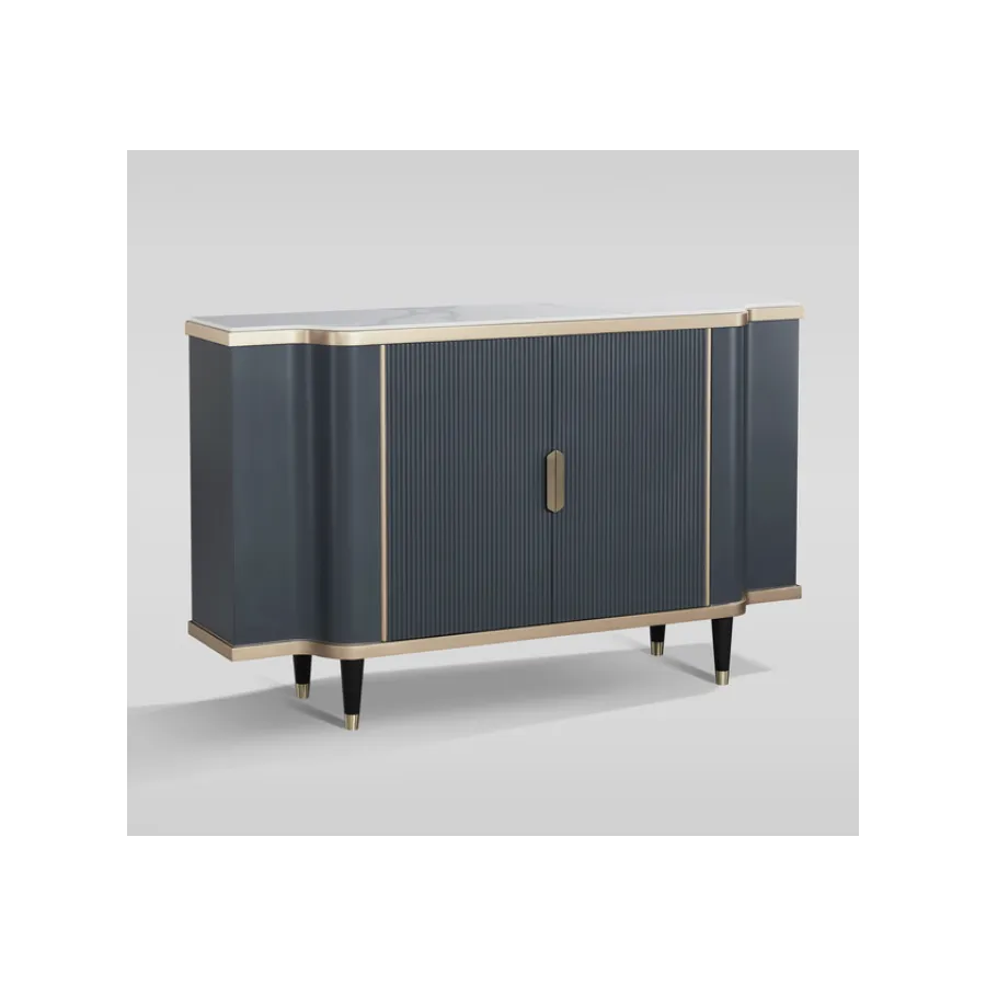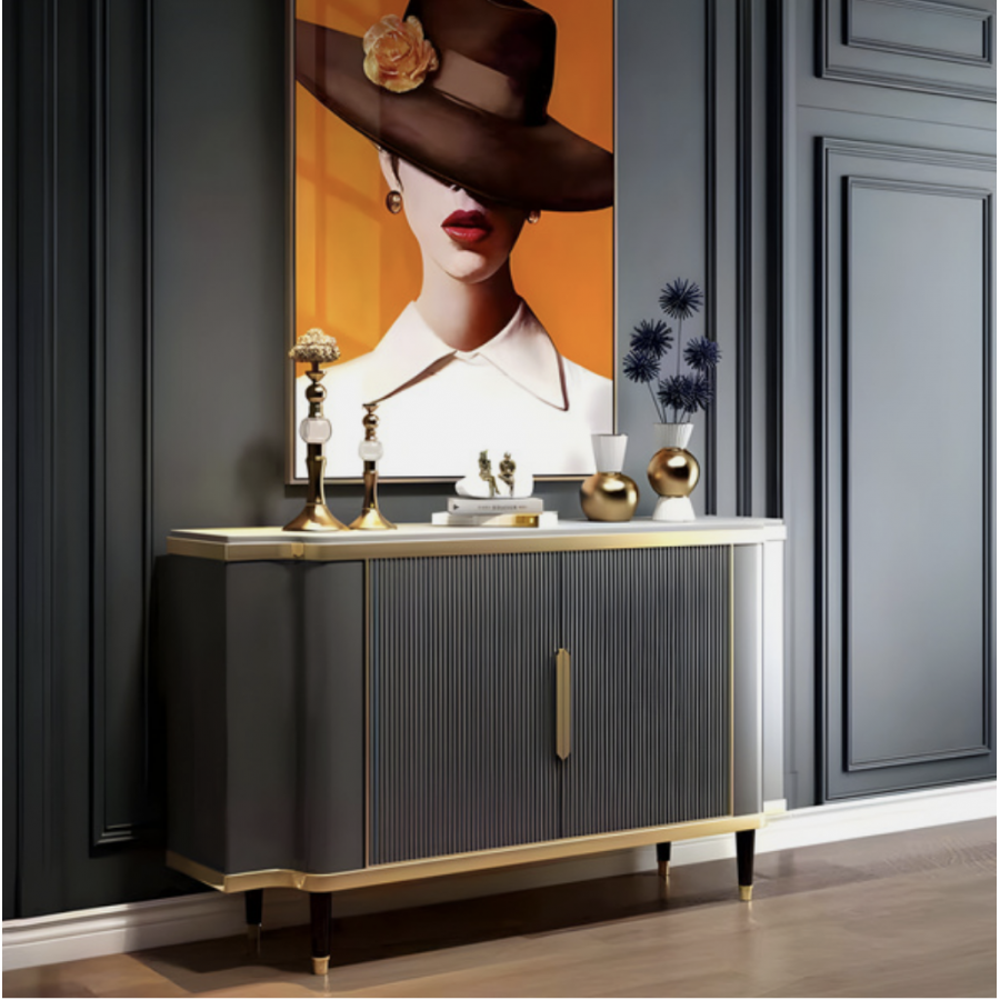 Stylowa komoda w kolorze grafitowym ze złotymi akcentami. Korpus posiada ryflowane drewno. Blat ma wykończenie marmurowe.