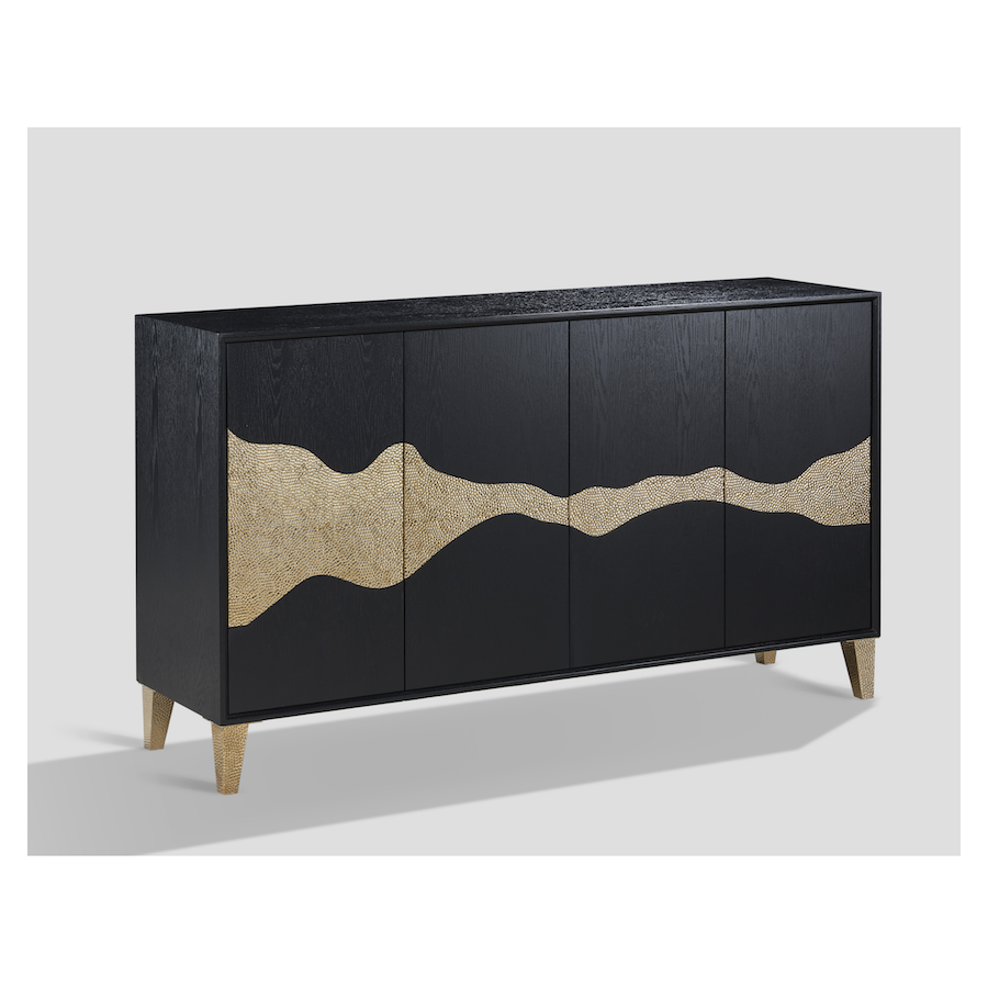 Oryginalna komoda w kolorze czarnym ze złotymi akcentami w postaci parametrycznego wzoru na drzwiach oraz nóżek w identycznym wykończeniu. Korpus jest pokryty okleiną w widoczną strukturą drewna.