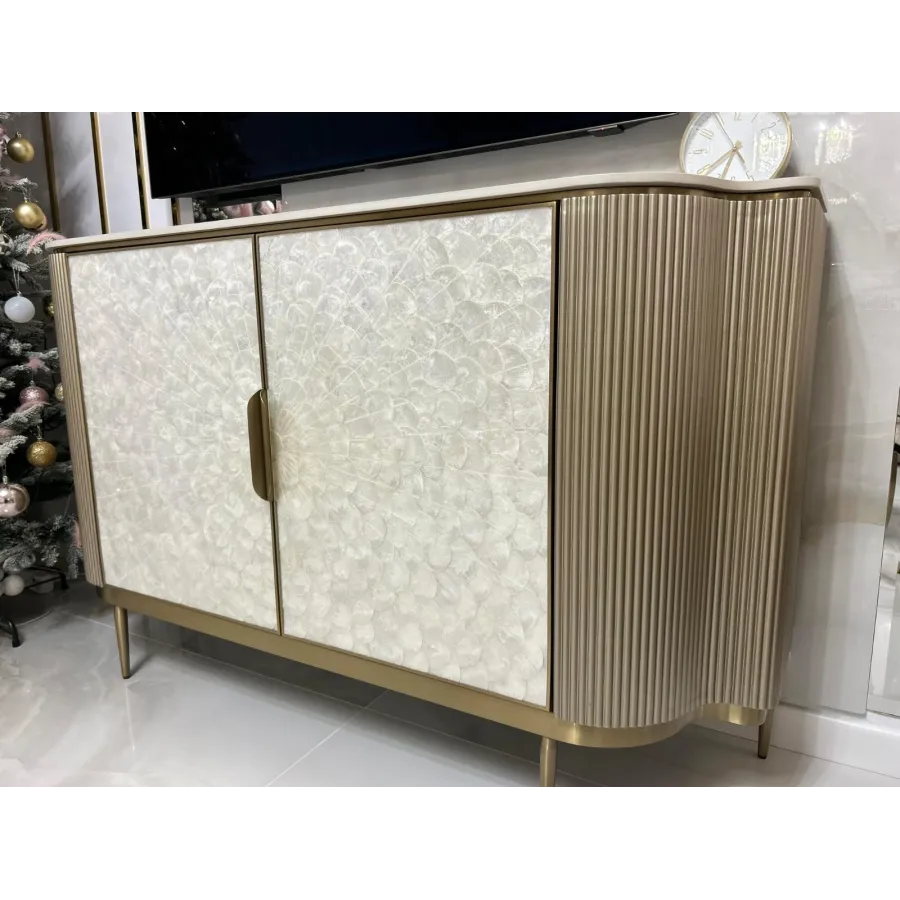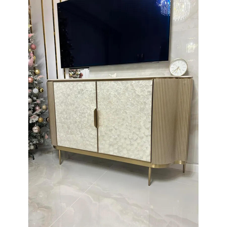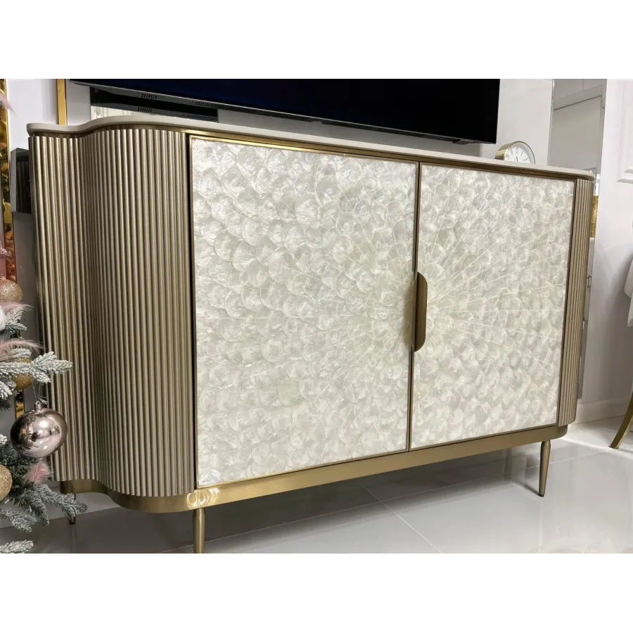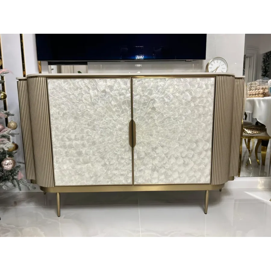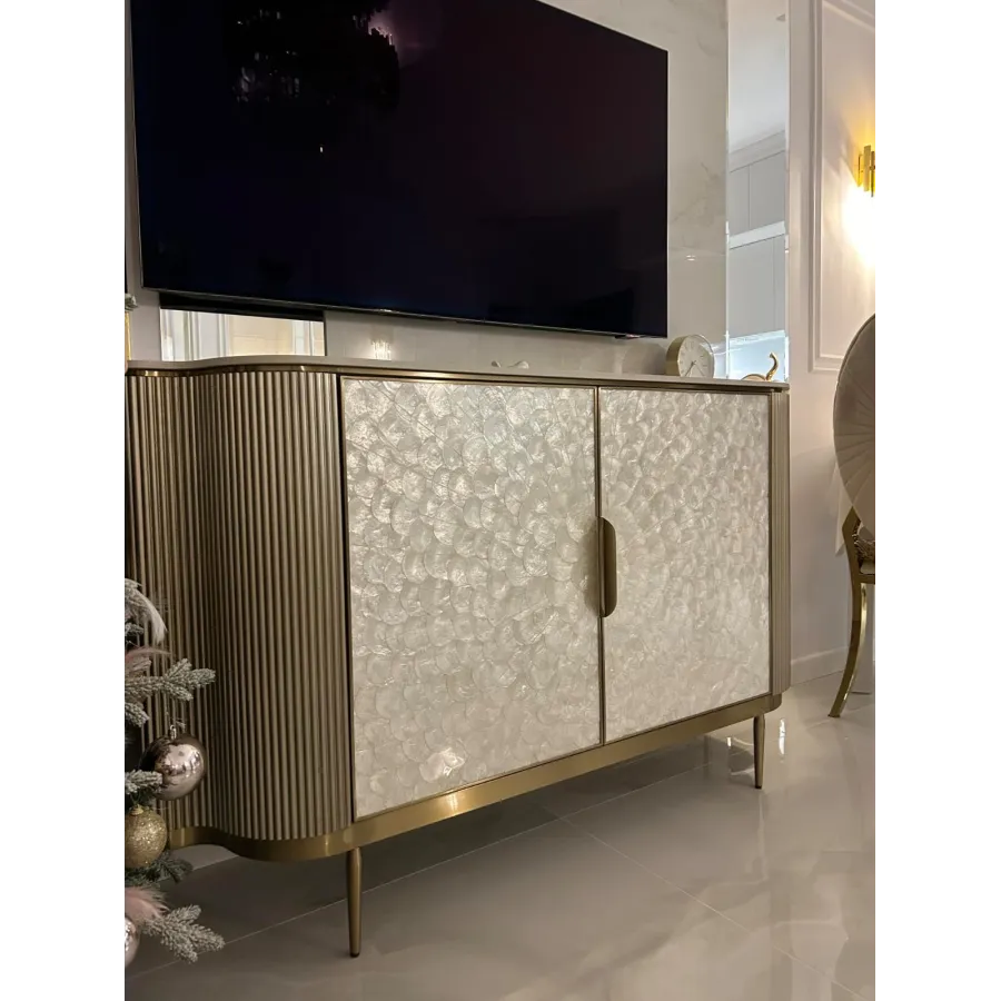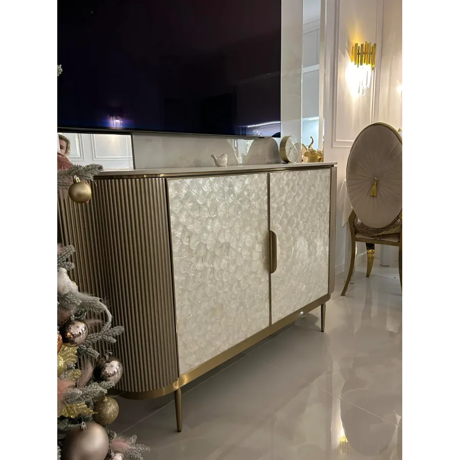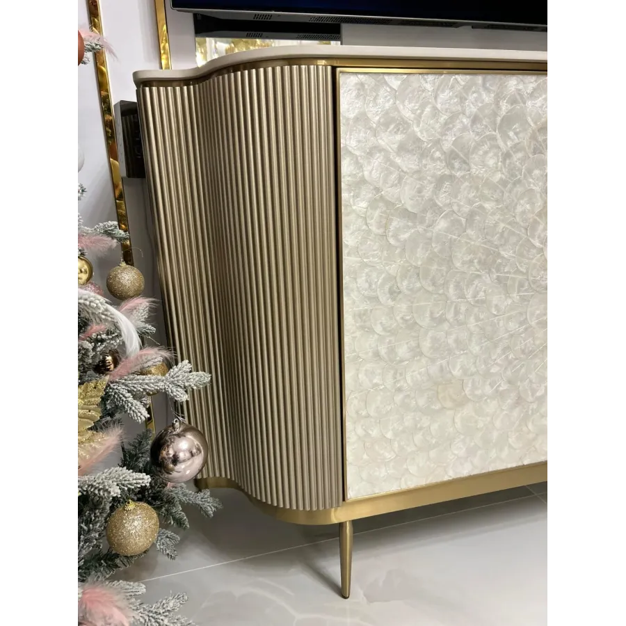 Oryginalna komoda w kolorze szampańskiego złota z frontem wykonanym z naturalnej muszli układającej się w symetryczny wzór. Korpus posiada ryflowane drewno oraz blat z wykończeniem marmurowym.