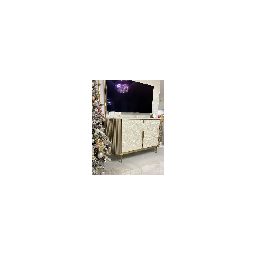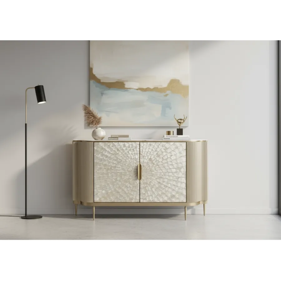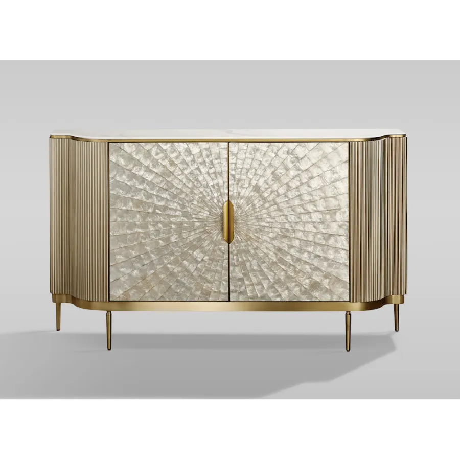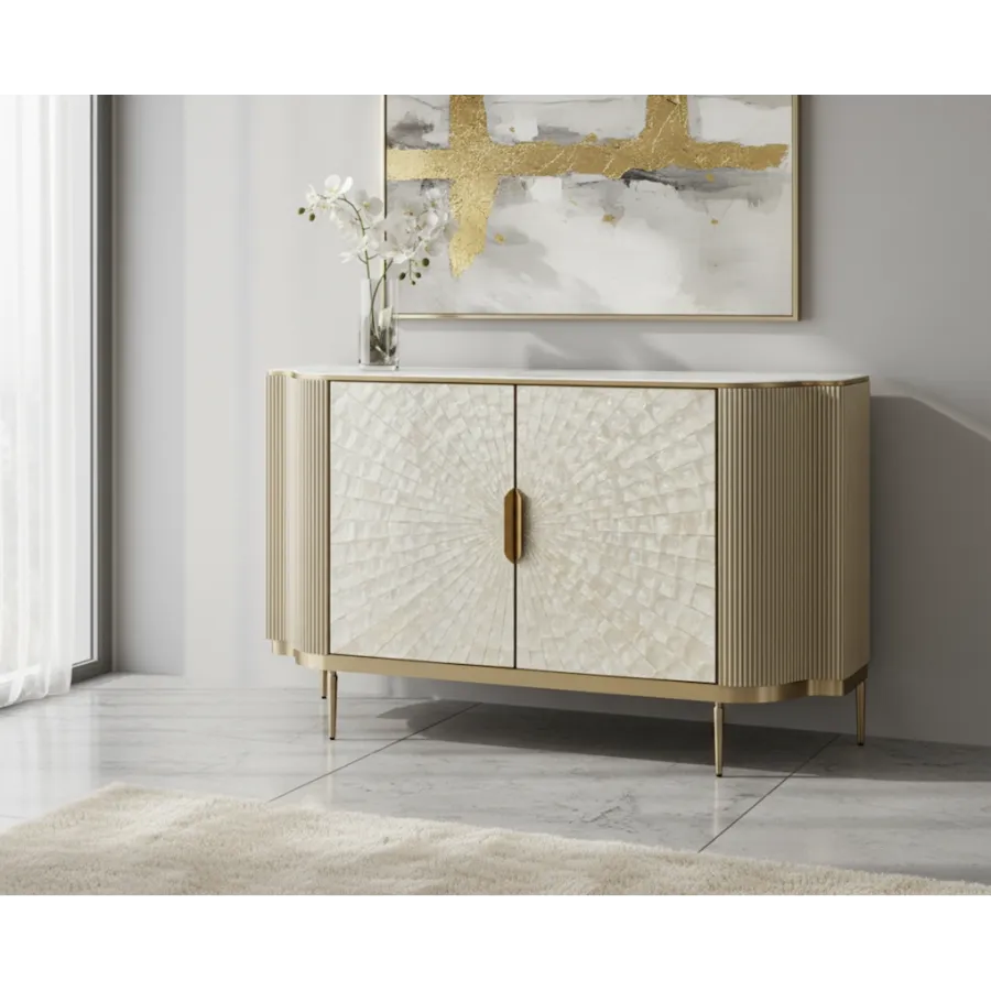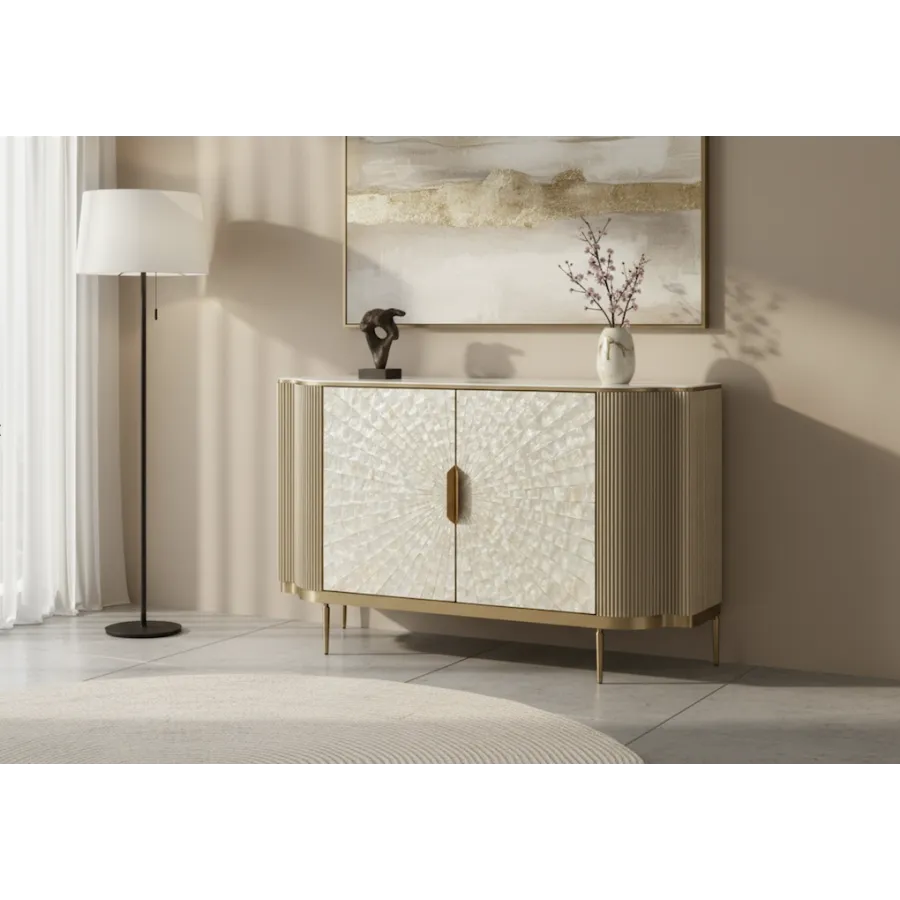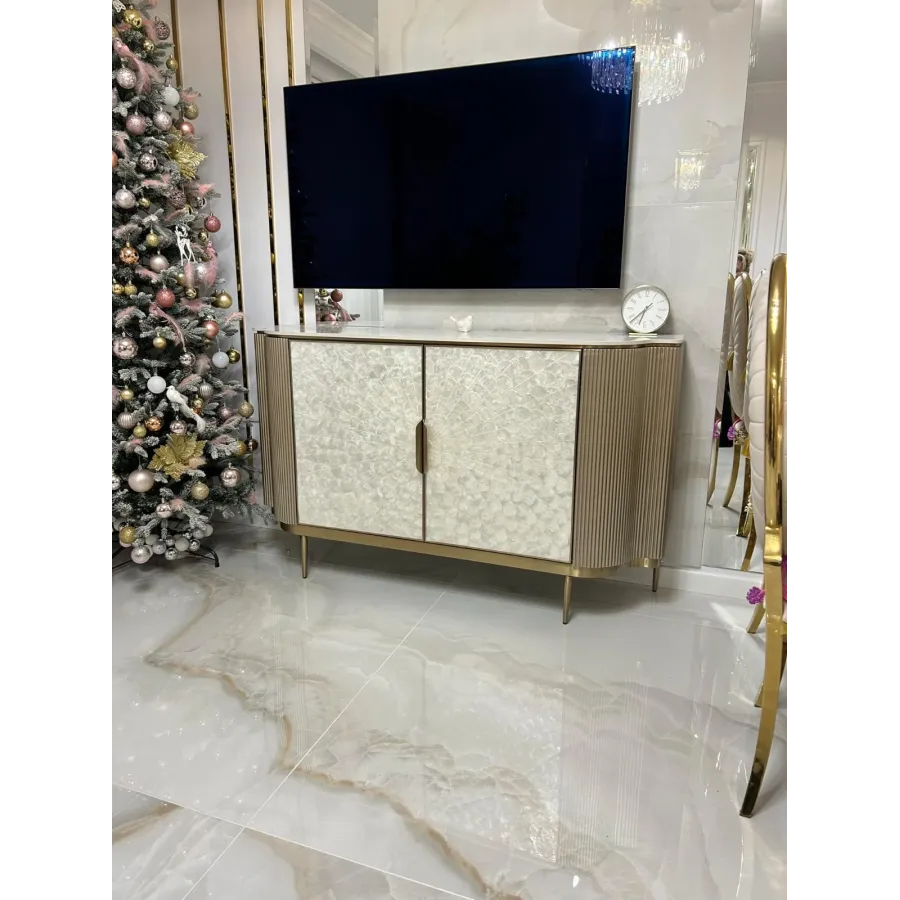Oryginalna komoda w kolorze szampańskiego złota z frontem wykonanym z naturalnej muszli układającej się w symetryczny wzór. Korpus posiada ryflowane drewno oraz blat z wykończeniem marmurowym.
