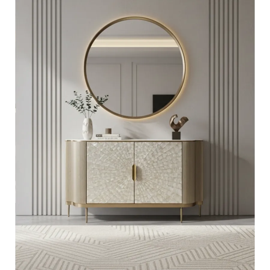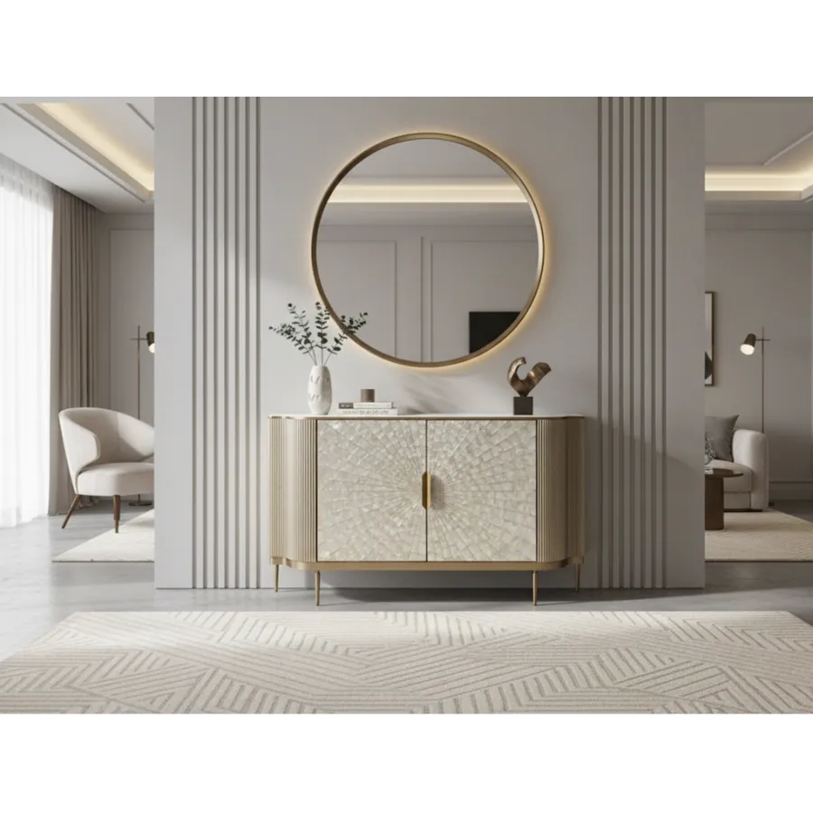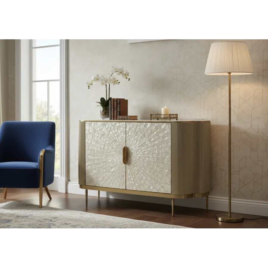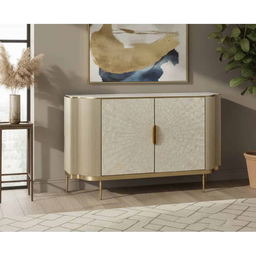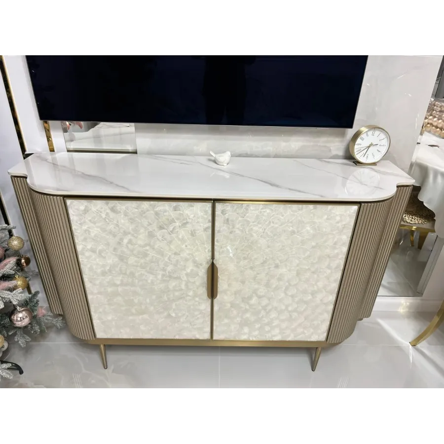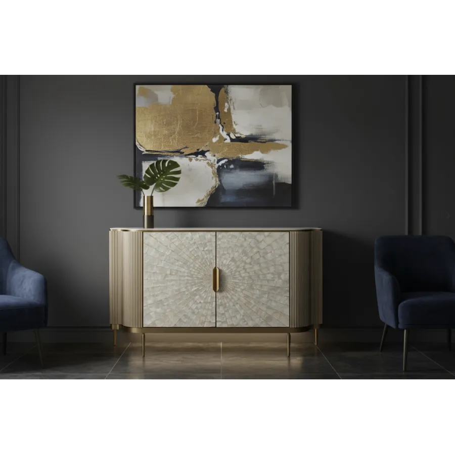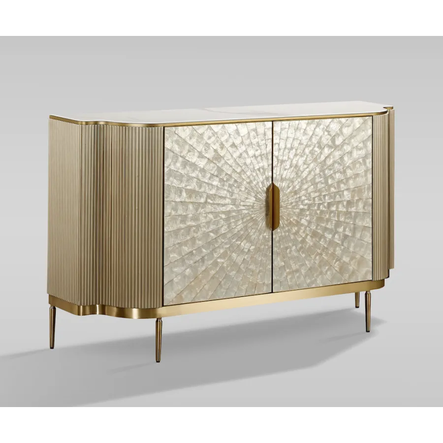 Oryginalna komoda w kolorze szampańskiego złota z frontem wykonanym z naturalnej muszli układającej się w symetryczny wzór. Korpus posiada ryflowane drewno oraz blat z wykończeniem marmurowym.