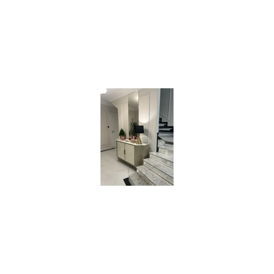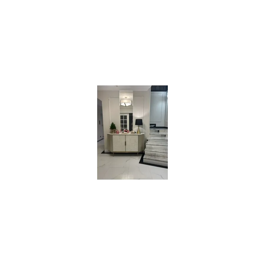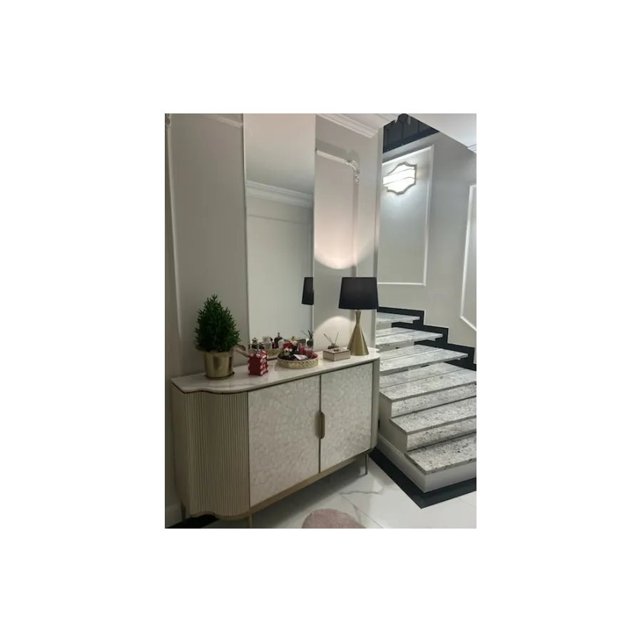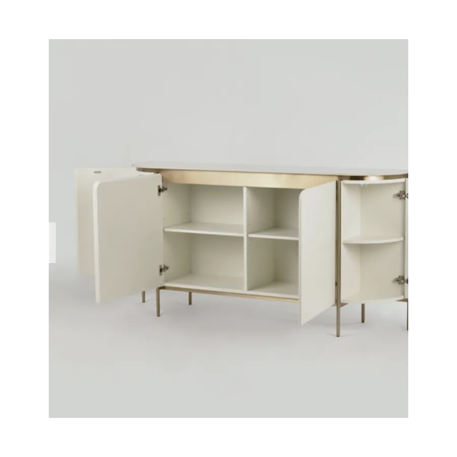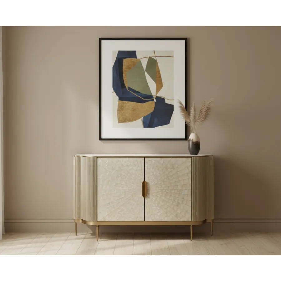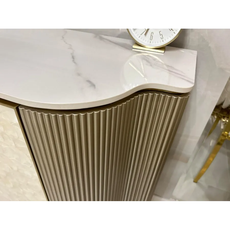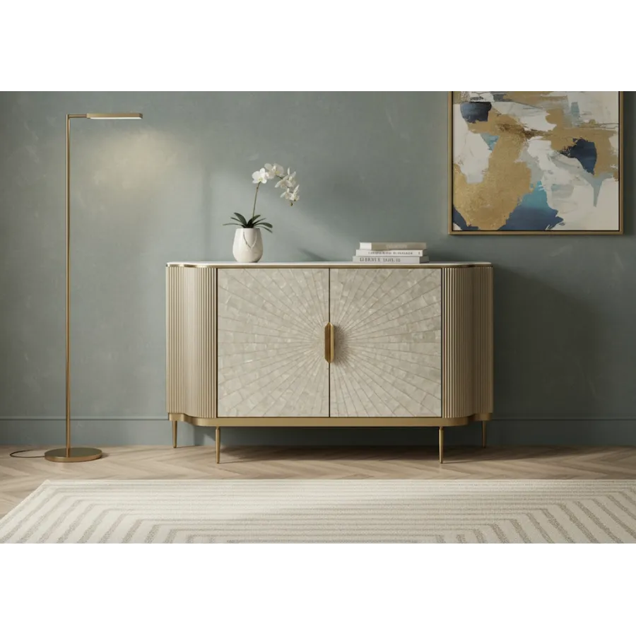 Oryginalna komoda w kolorze szampańskiego złota z frontem wykonanym z naturalnej muszli układającej się w symetryczny wzór. Korpus posiada ryflowane drewno oraz blat z wykończeniem marmurowym.