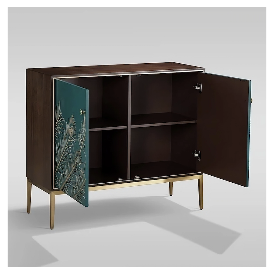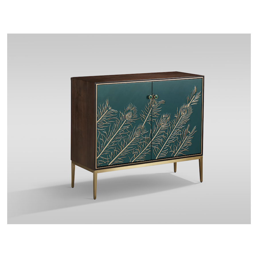 Oryginalna komoda w kolorze orzechowym z turkusowym frontem ze złotymi akcentami w postaci wytłoczonego wzoru w kształcie pawich piór, ozobnej listwy wokół drzwi oraz złotymi nogami. Korpus jest pokryty okleiną w widoczną strukturą drewna.