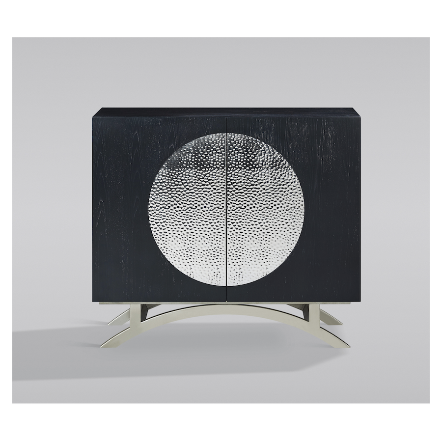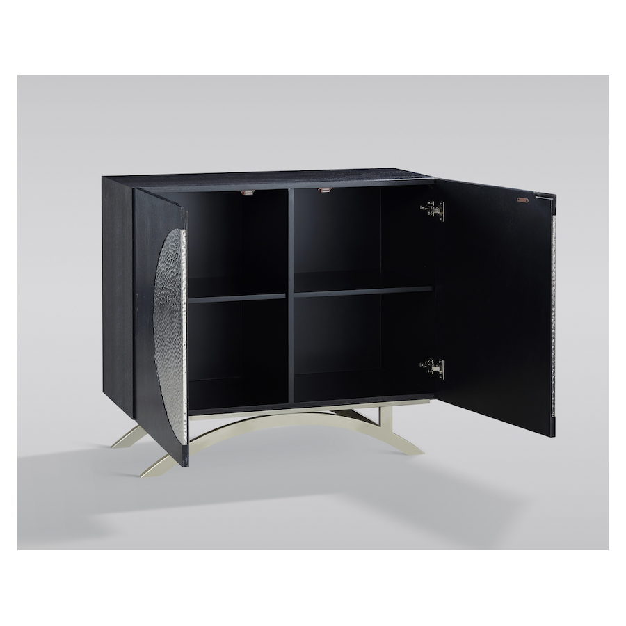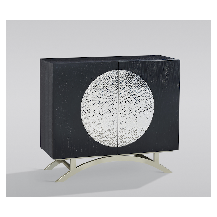 Oryginalna komoda w kolorze czarnym z chromowanymi nogami i akcentami w postaci parametrycznego wzoru w kształcie koła na drzwiach. Korpus jest pokryty okleiną w widoczną strukturą drewna.