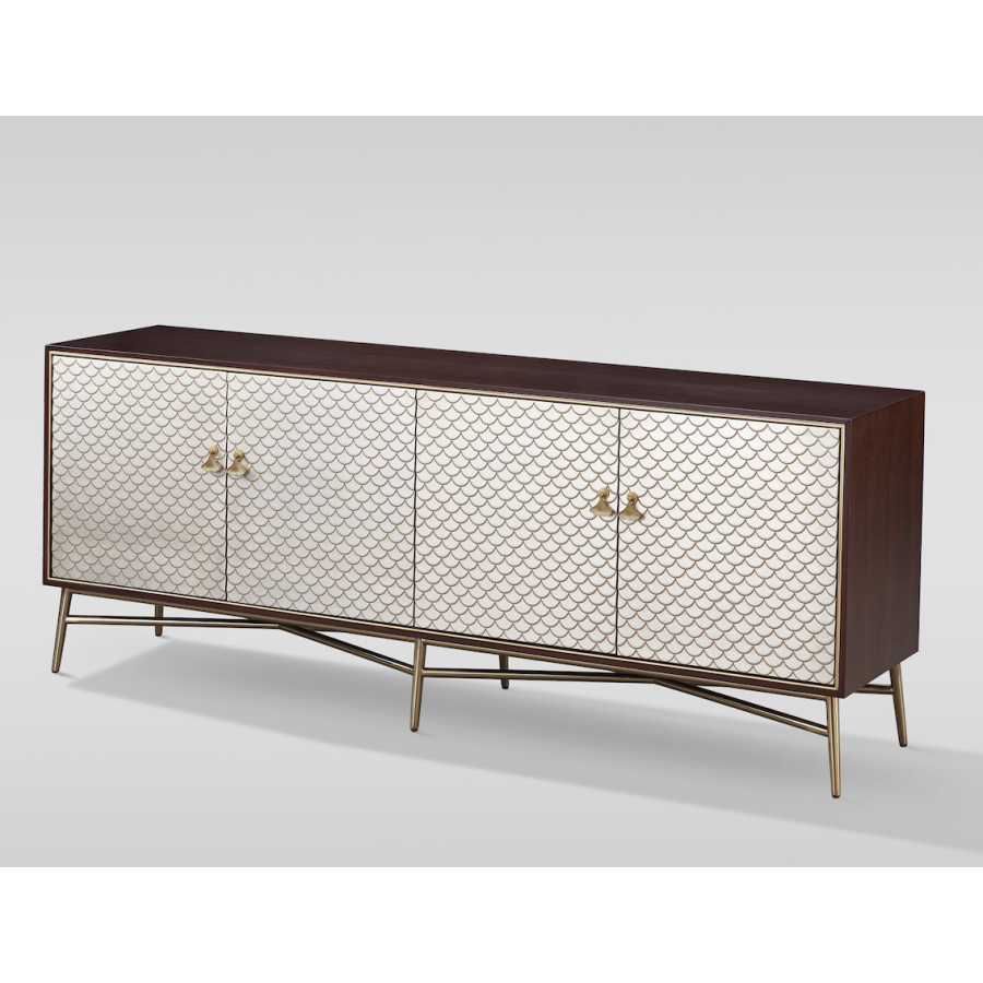 Stylowa komoda w kolorze orzecha włoskiego z frontem z szampańskim-złotym, wypukłym wzorem w kształcie rybiej łuski oraz ze złotymi nogami. Złote obramowanie frontu i ozdobne uchwyty w kształcie liścia miłorzębu nadają całości szyku i elegancji.