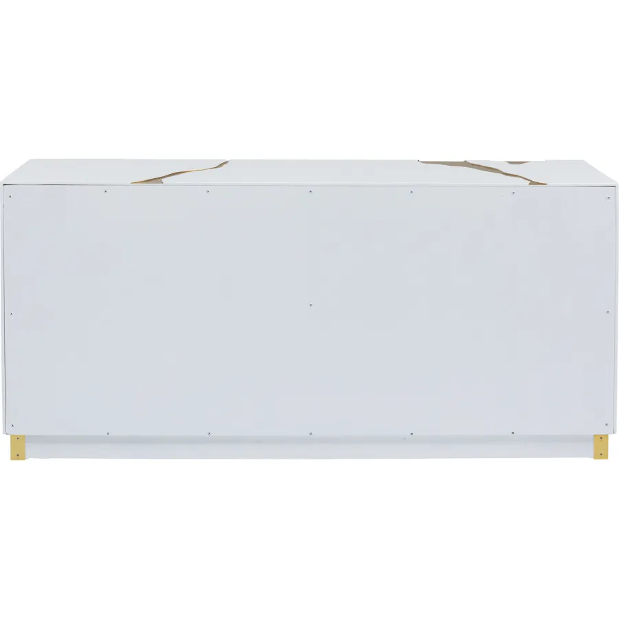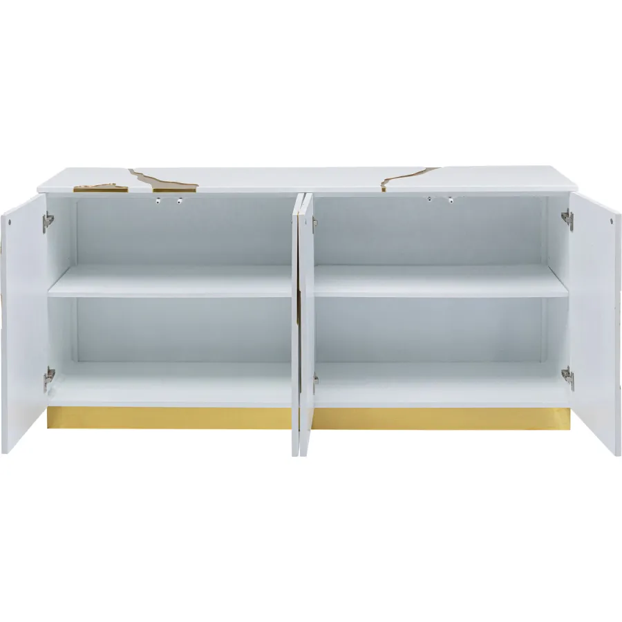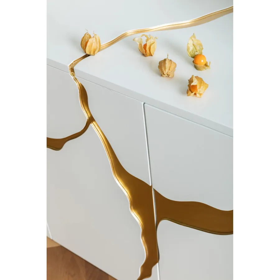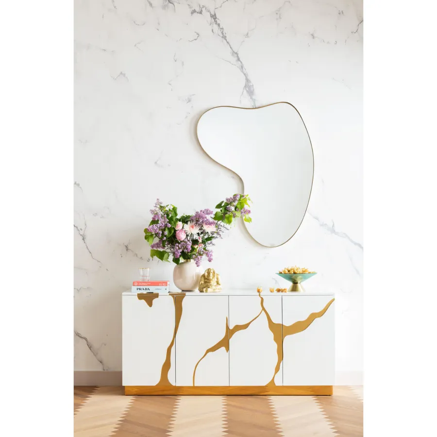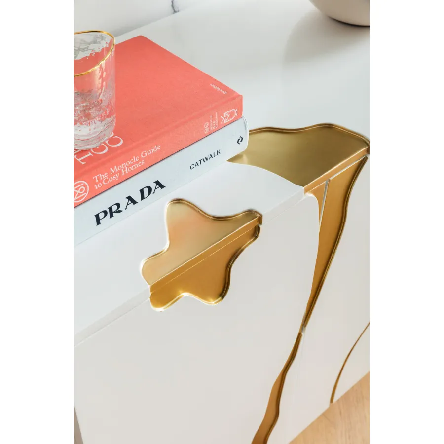 Wystarczy przetrzeć wilgotną, miękką bawełnianą szmatką. Ten designerski mebel marki KARE to minimalistyczne arcydzieło. Można go łatwo łączyć z wieloma stylami wyposażenia, nie tylko w salonie, czy to klasycznym, nowoczesnym czy glamour eleganckim. Abstrakcyjne ozdoby w złotym kolorze optycznie opływają blat i fronty drzwi tego kredensu. Całość uzupełnia lampa stołowa i dekoracyjne dodatki do domu, takie jak wazony i fajne przedmioty. Przejrzysty, purystyczny kształt sprawia, że kredens oferuje w swoim wnętrzu mnóstwo miejsca do porządkowania i przechowywania. Ponieważ ten produkt jest częściowo wykonany ręcznie, możliwe są niewielkie odchylenia od ilustracji