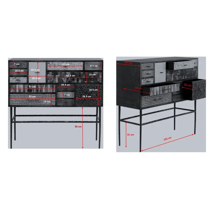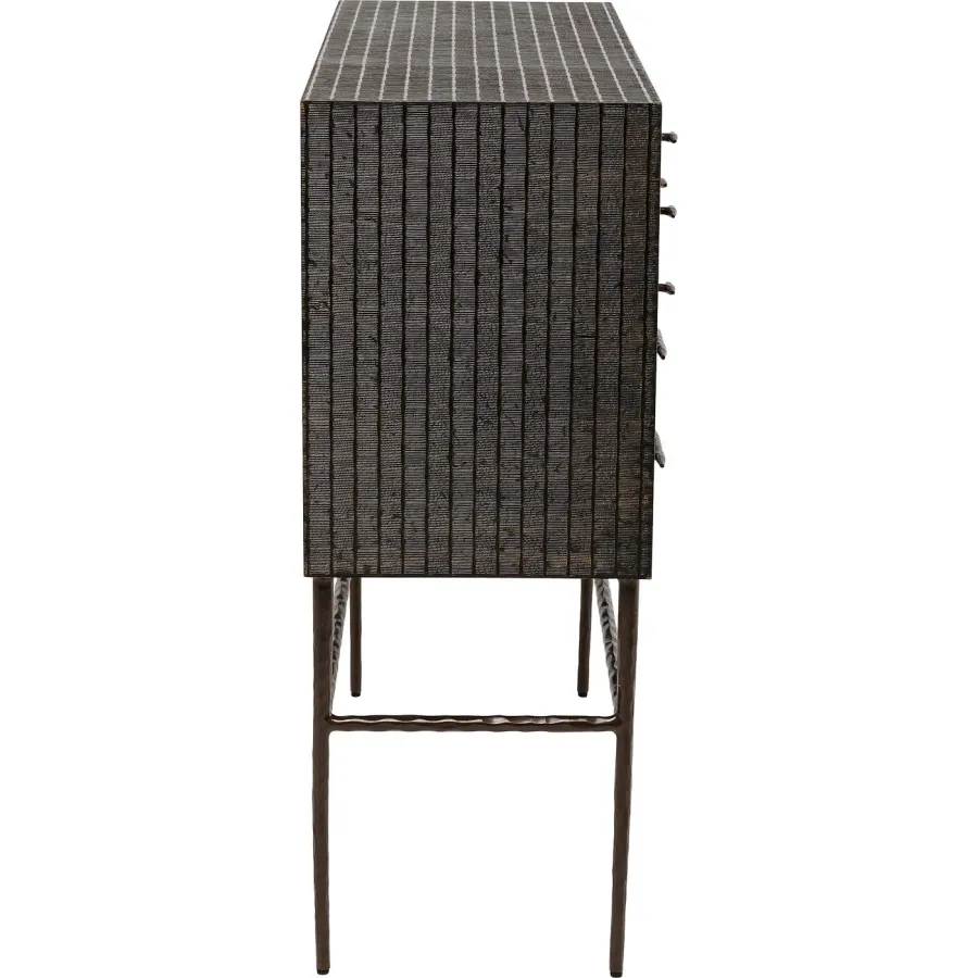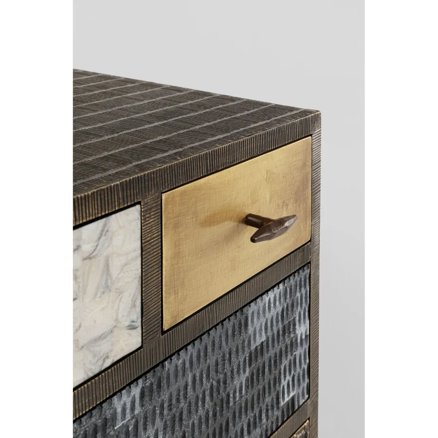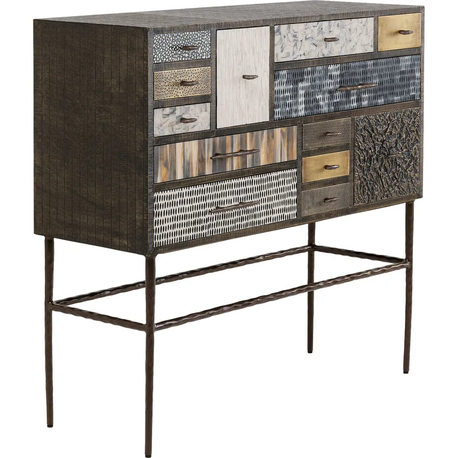 Wysoki kredens zachwyca udanym połączeniem różnych faktur powierzchni, nietypowych wzorów i naturalnych kolorów. 13 różnych szuflad zapewnia mnóstwo miejsca na przedmioty codziennego użytku w każdym pomieszczeniu mieszkalnym. Smukłe, dyskretne nogi zapewniają stylowy akcent i stabilność. Czy to w przedpokoju jako praktyczna półka, w sypialni do przechowywania, czy jako przyciągający wzrok w salonie - ten mebel harmonijnie wtapia się w różne wnętrza i łączy w sobie funkcjonalność z wyrazistym designem