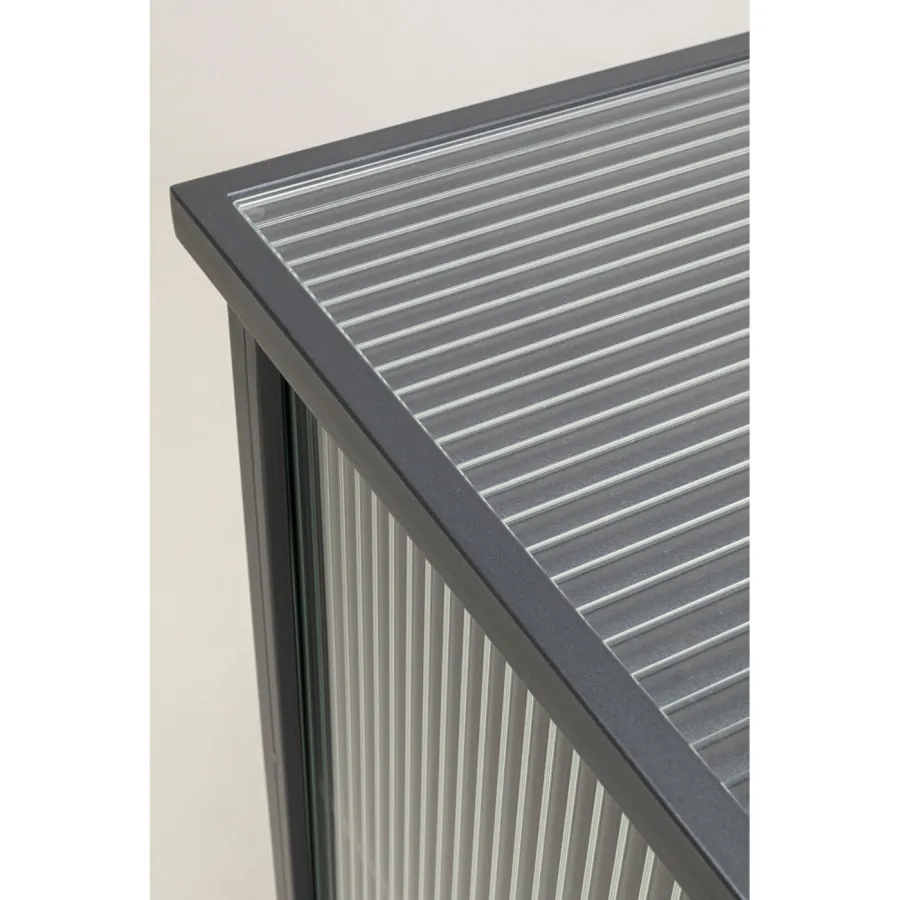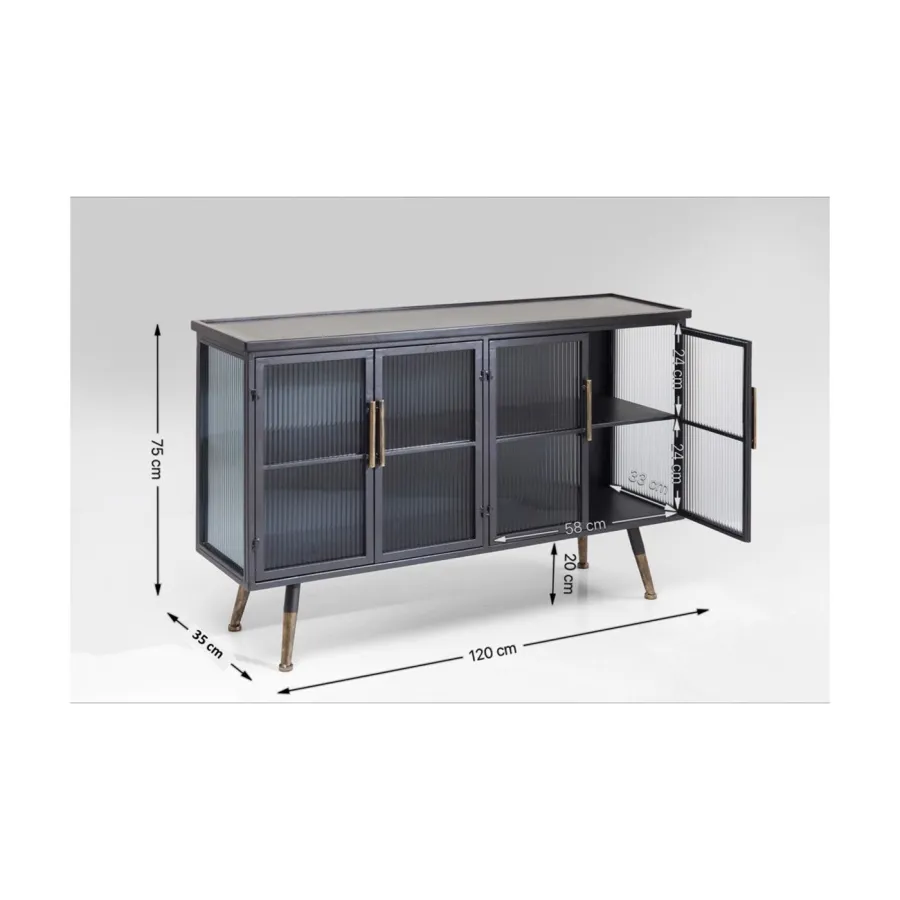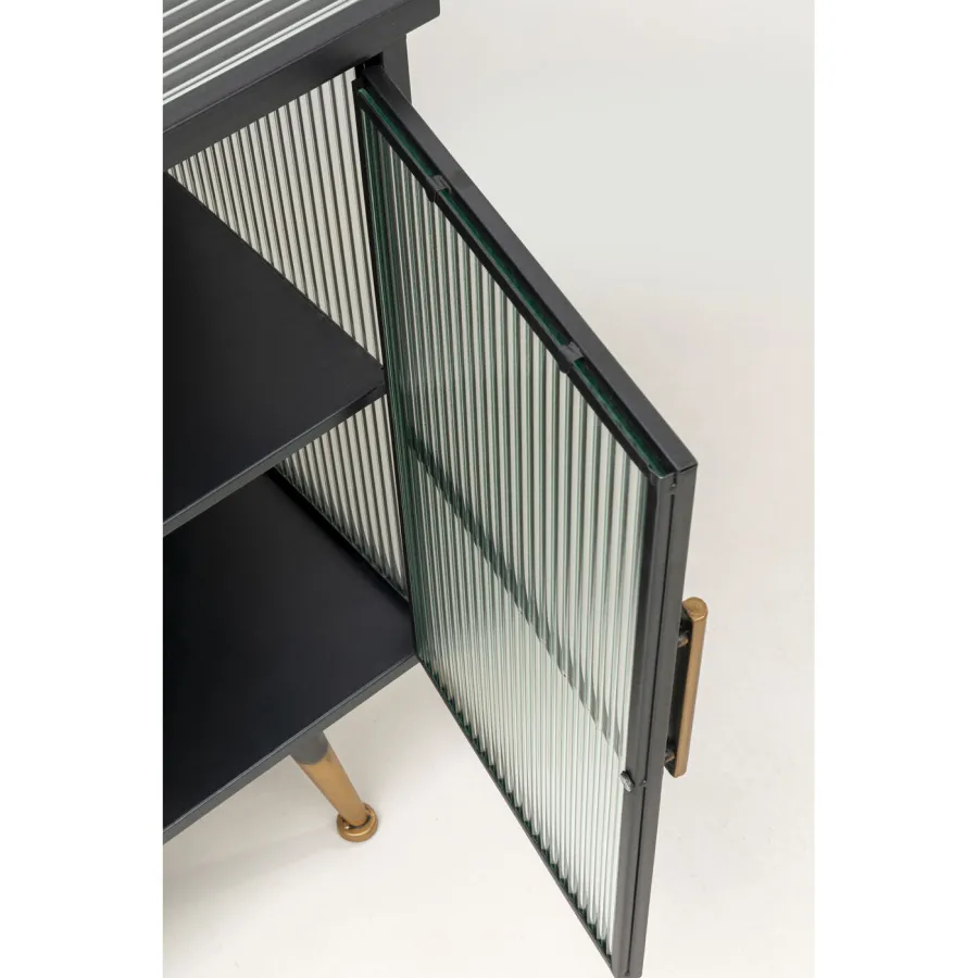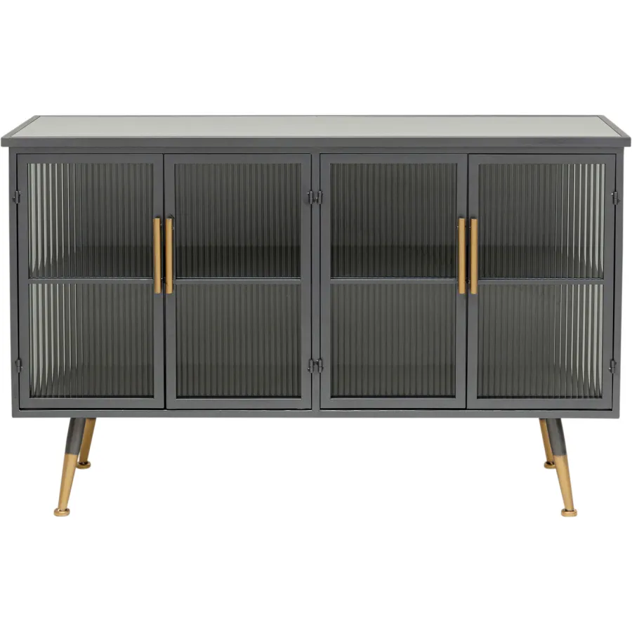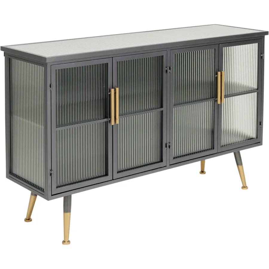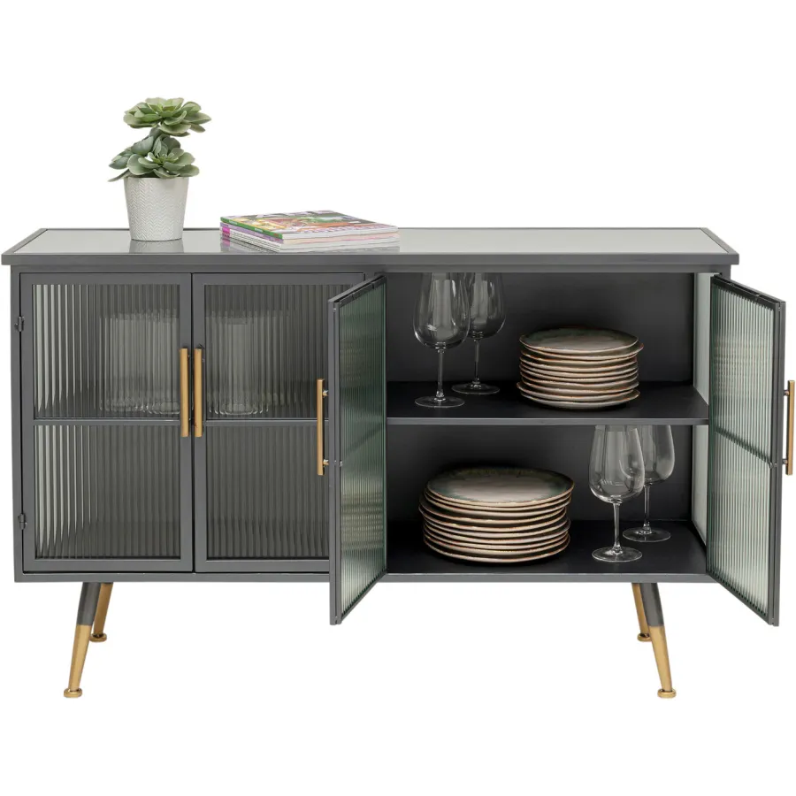 Powlekana stal i szkło – to składniki, które definiują swobodny wygląd tego kredensu. O ile rama tego czterodrzwiowego meblościanki wykonana jest ze stali i nawiązuje do wzornictwa przemysłowego, o tyle fronty i boki wykonano z ryflowanego szkła – to nadaje kredensowi pewnej elegancji i lekkości. Seria La Gomera, obejmująca różne szafki i komody, charakteryzuje się mieszanką materiałów stalowych i szklanych, wyrazistymi liniami i lekko rozszerzonymi nóżkami