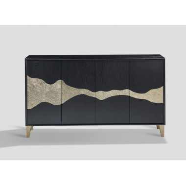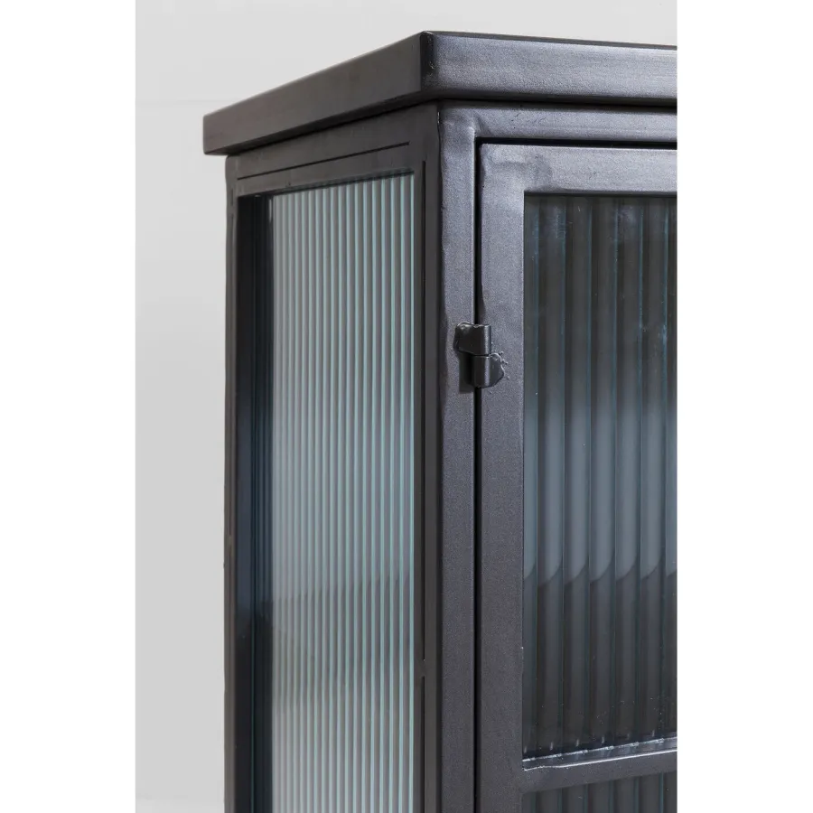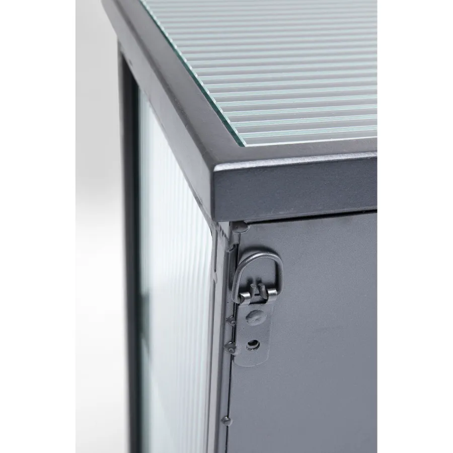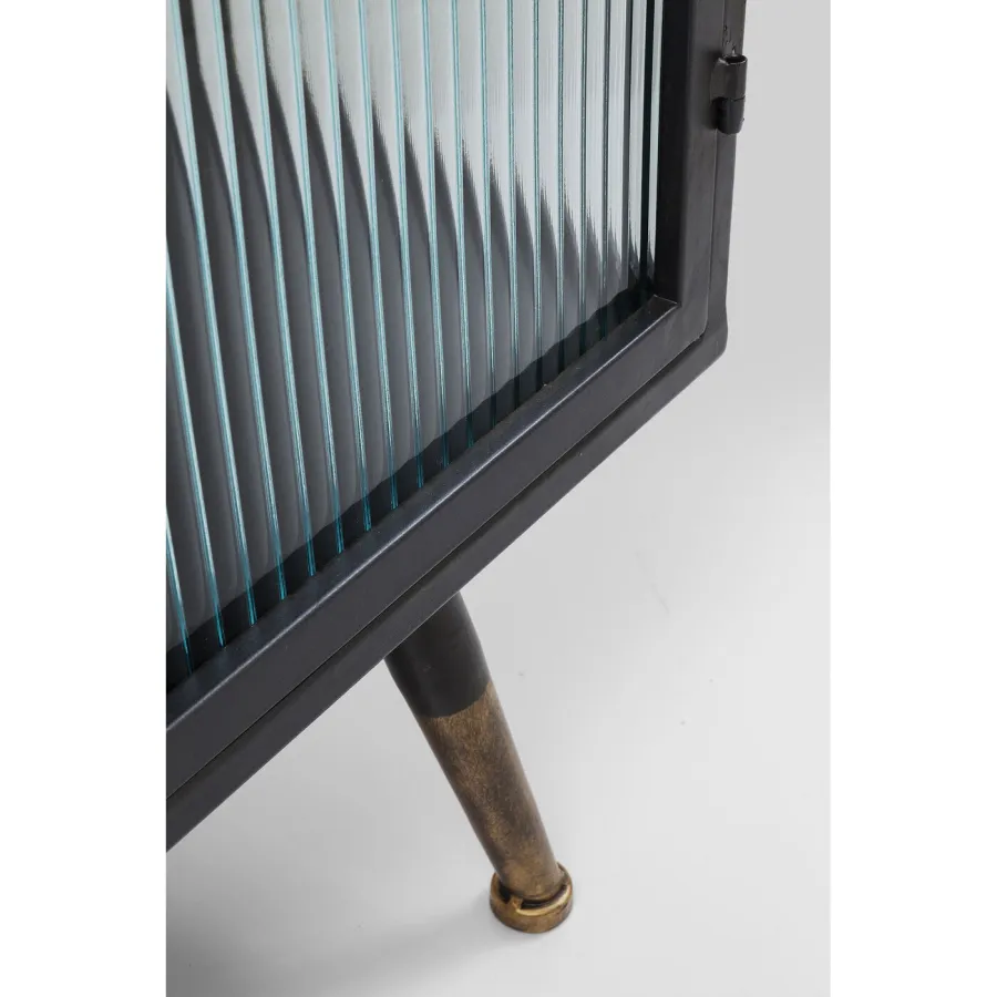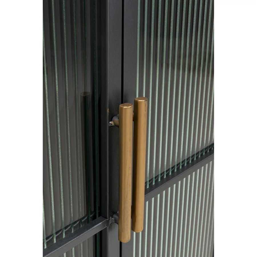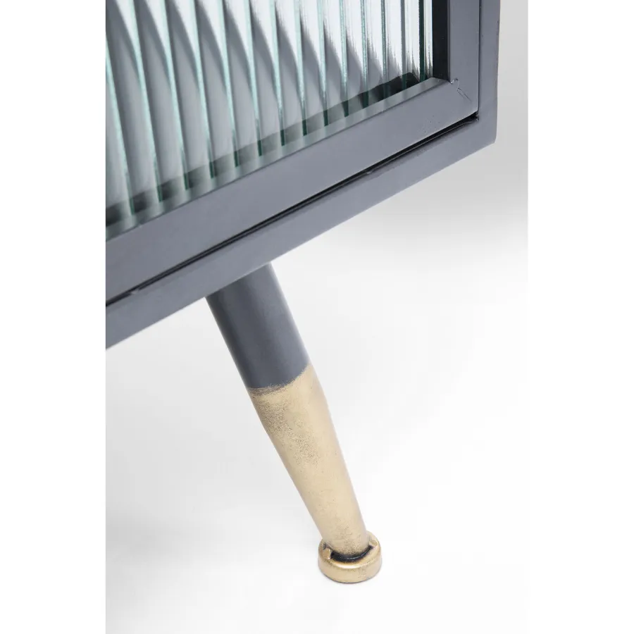 Powlekana stal i szkło – to składniki, które definiują swobodny wygląd tego kredensu. O ile rama tego czterodrzwiowego meblościanki wykonana jest ze stali i nawiązuje do wzornictwa przemysłowego, o tyle fronty i boki wykonano z ryflowanego szkła – to nadaje kredensowi pewnej elegancji i lekkości. Seria La Gomera, obejmująca różne szafki i komody, charakteryzuje się mieszanką materiałów stalowych i szklanych, wyrazistymi liniami i lekko rozszerzonymi nóżkami