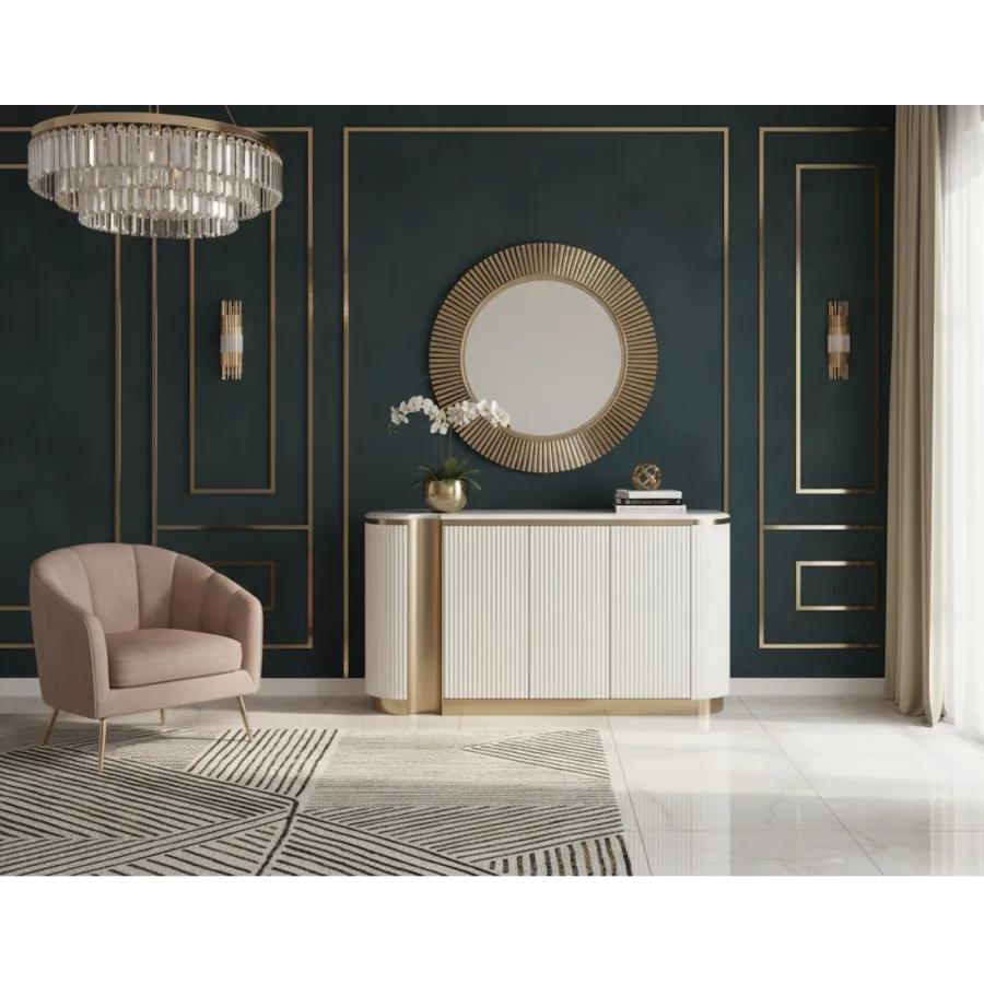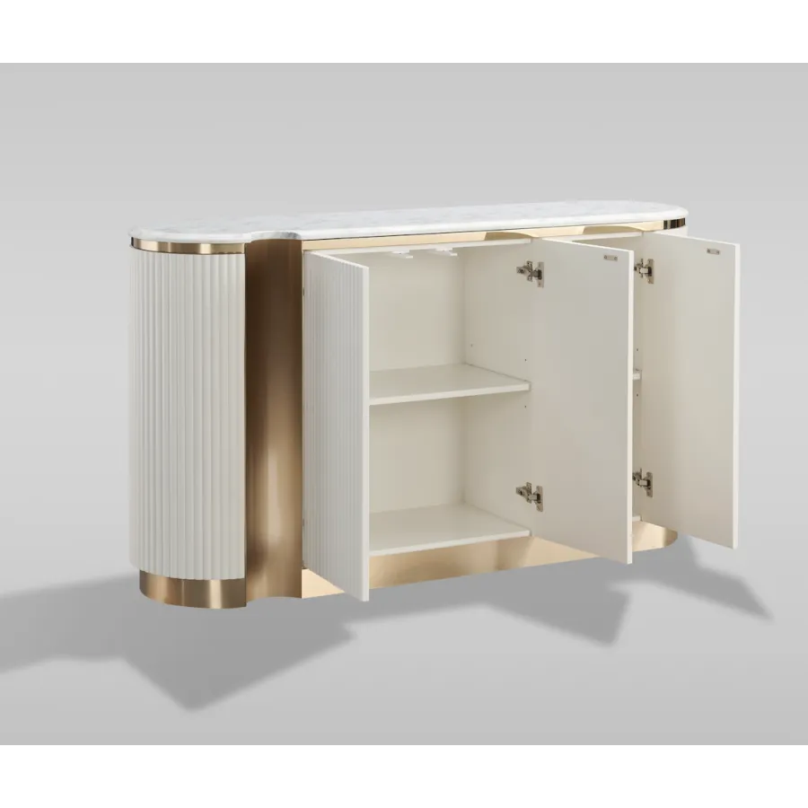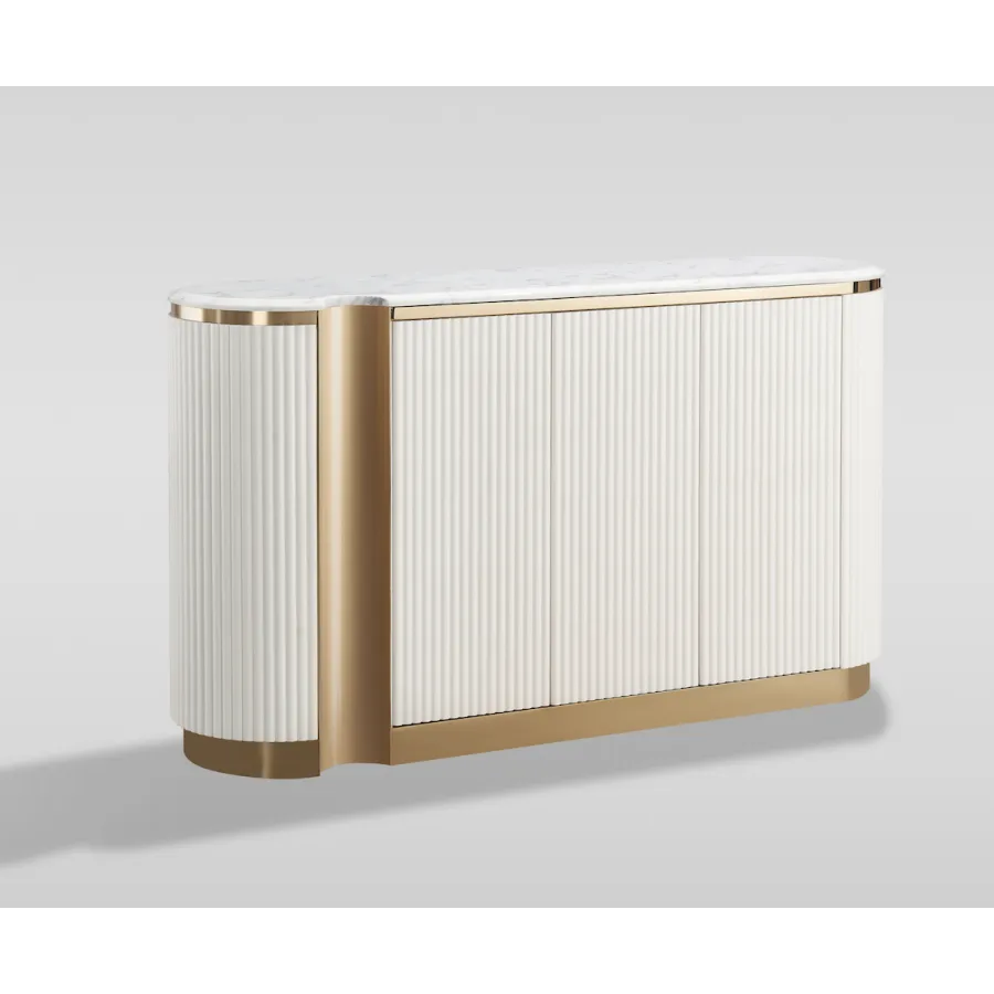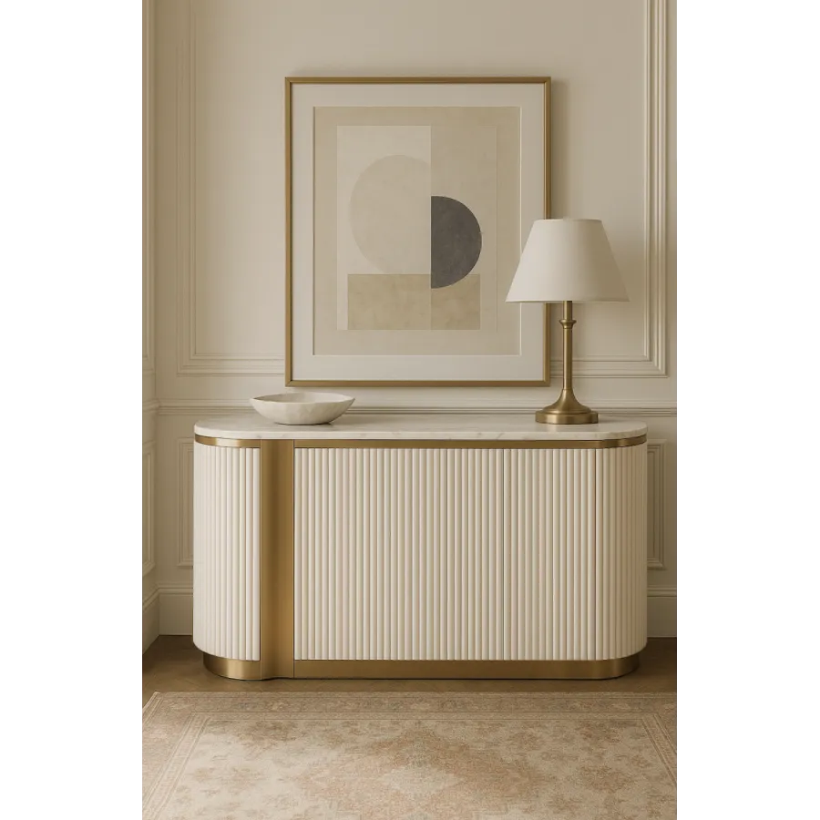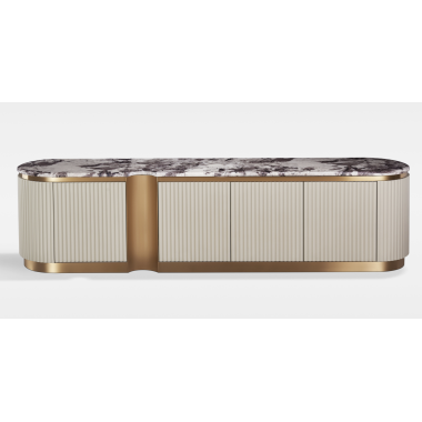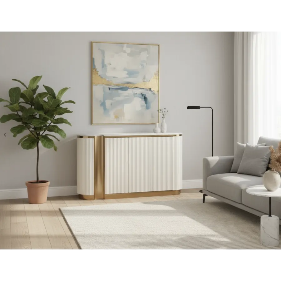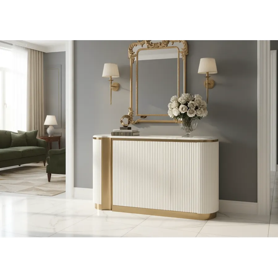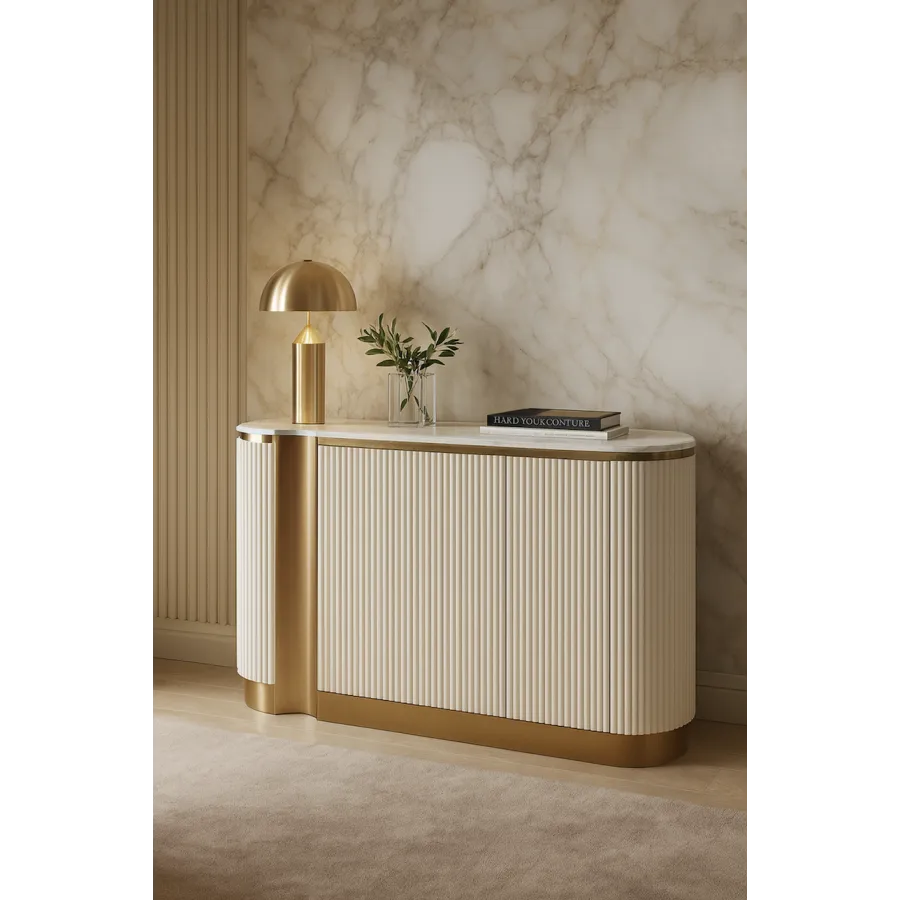 • Stylowa komoda w kolorze jasnokremowym ze złotymi akcentami i wieńcem dolnym. Korpus posiada ryflowane drewno. Blat ma wykończenie marmurowe.