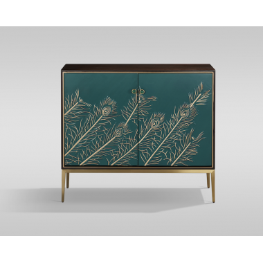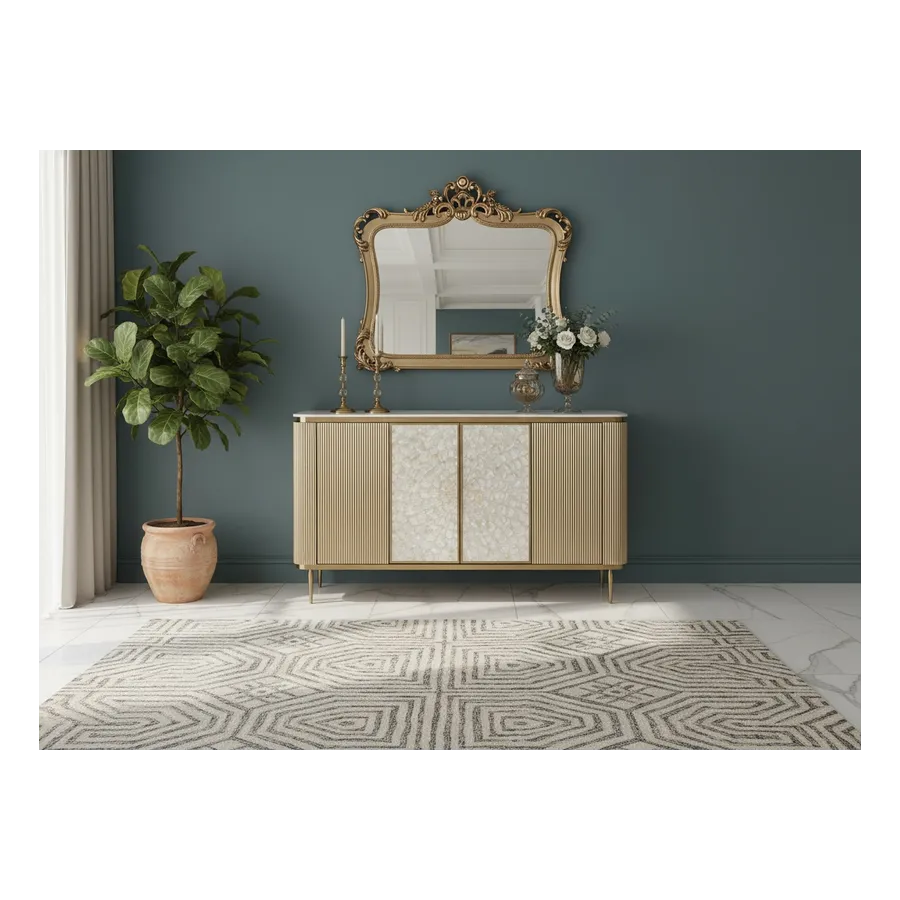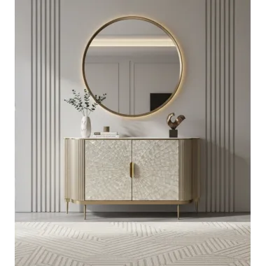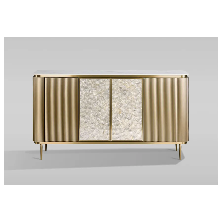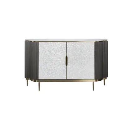 Ta niezwykle elegancka komoda to połączenie luksusu, rzemiosła i unikatowych materiałów. Fronty wykonane są z naturalnej masy perłowej (muszli), starannie ułożonej w symetryczny, dekoracyjny wzór, który subtelnie odbija światło, tworząc efekt biżuteryjnego połysku. Każdy front jest niepowtarzalny – struktura i układ muszli sprawiają, że każda komoda ma swój indywidualny charakter.