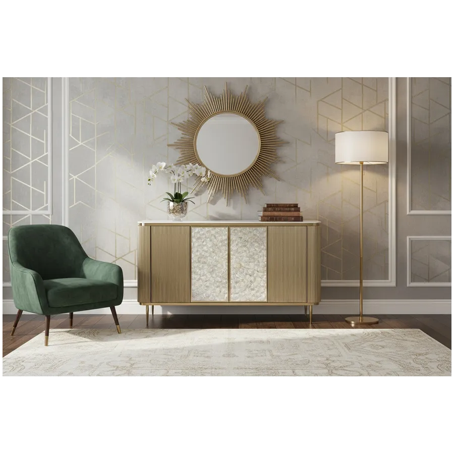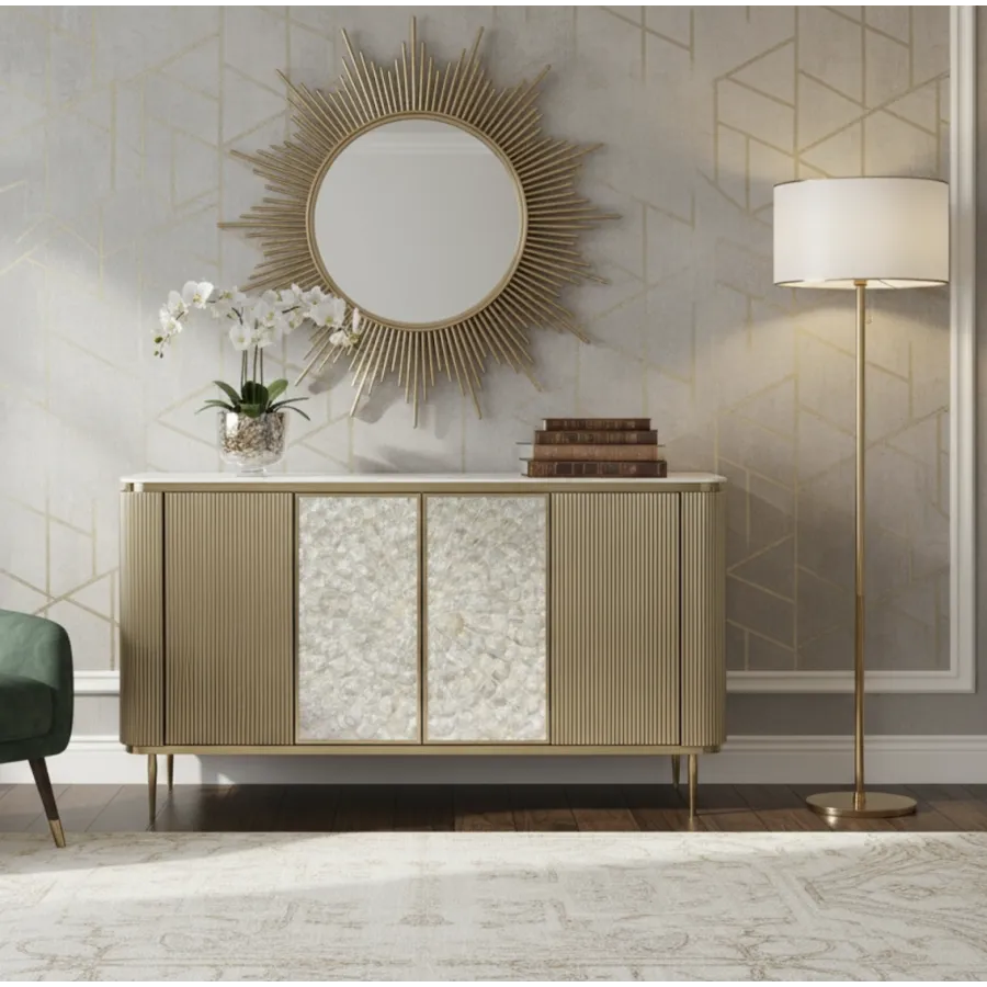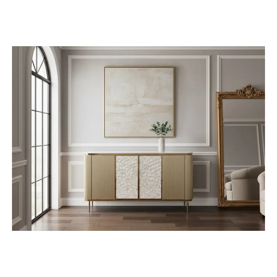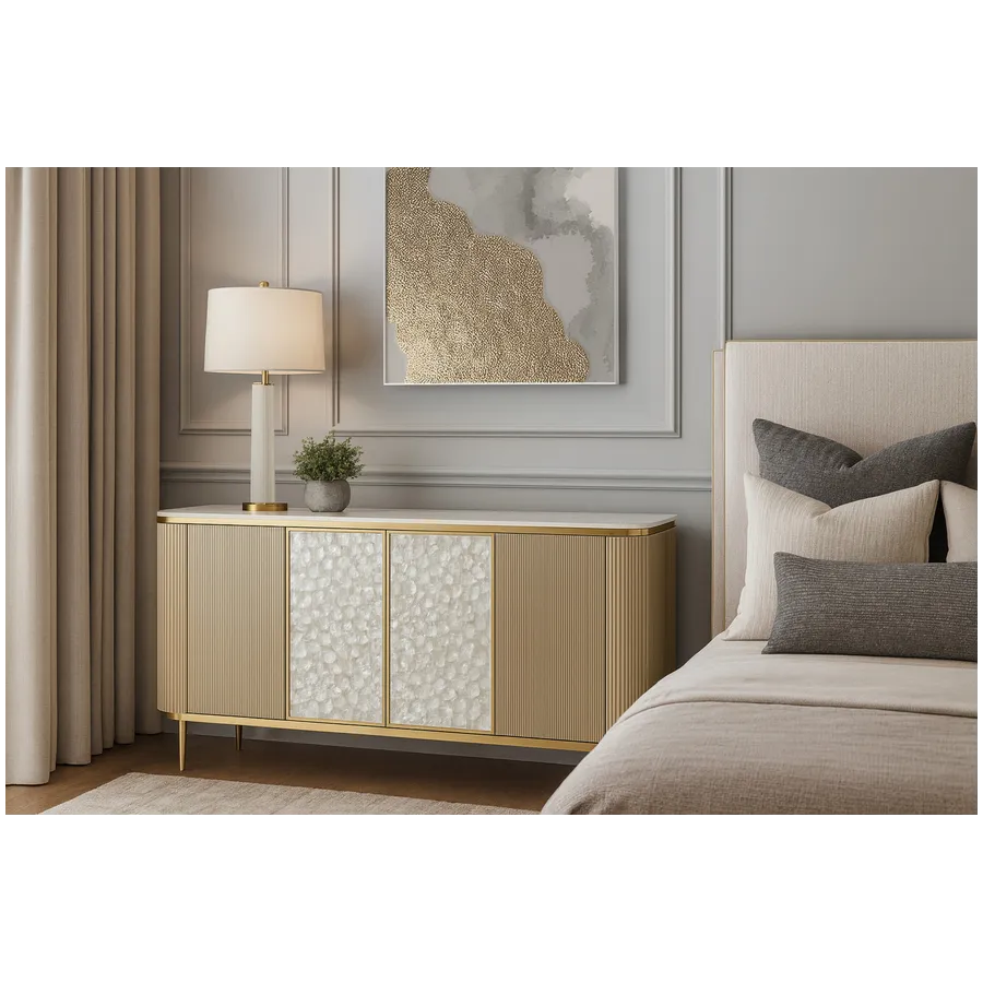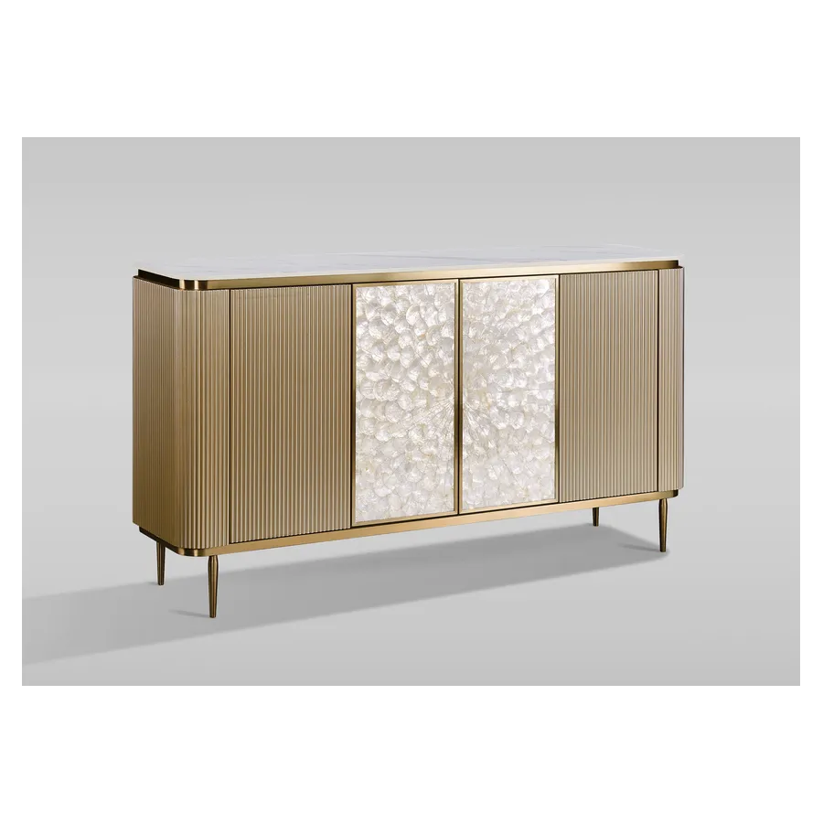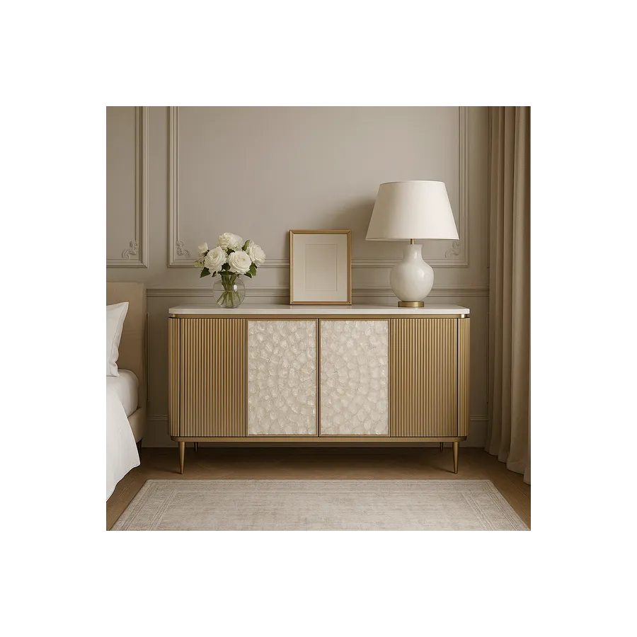 Ekskluzywna komoda w kolorze szampańskiego złota z frontami z naturalnej muszli